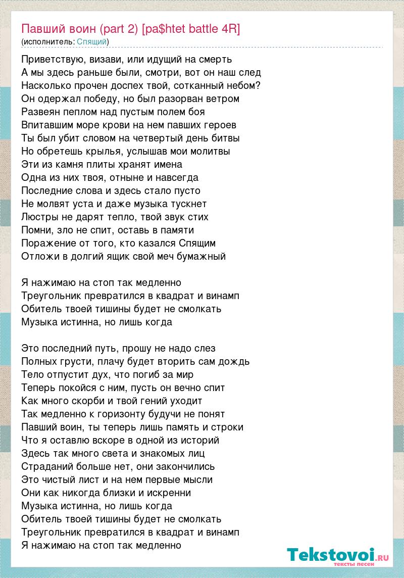 Приветствую, визави, или идущий на смерть А мы здесь раньше были, смотри, вот он наш след Насколько прочен доспех твой, сотканный небом? Он одержал победу, но был разорван ветром Развеян пеплом над пустым полем боя Впитавшим море крови на нем павших героев Ты был убит словом на четвертый день битвы Но обретешь крылья, услышав мои молитвы Эти из камня плиты хранят имена Одна из них твоя, отныне и навсегда Последние слова и здесь стало пусто Не молвят уста и даже музыка тускнет Люстры не дарят тепло, твой звук стих Помни, зло не спит, оставь в памяти Поражение от того, кто казался Спящим Отложи в долгий ящик свой меч бумажный Я нажимаю на стоп так медленно Треугольник превратился в квадрат и винамп Обитель твоей тишины будет не смолкать Музыка истинна, но лишь когда Это последний путь, прошу не надо слез Полных грусти, плачу будет вторить сам дождь Тело отпустит дух, что погиб за мир Теперь покойся с ним, пусть он вечно спит Как много скорби и твой гений уходит Так медленно к горизонту будучи не понят Павший воин, ты теперь лишь память и строки Что я оставлю вскоре в одной из историй Здесь так много света и знакомых лиц Страданий больше нет, они закончились Это чистый лист и на нем первые мысли Они как никогда близки и искренни Музыка истинна, но лишь когда Обитель твоей тишины будет не смолкать Треугольник превратился в квадрат и винамп Я нажимаю на стоп так медленно
