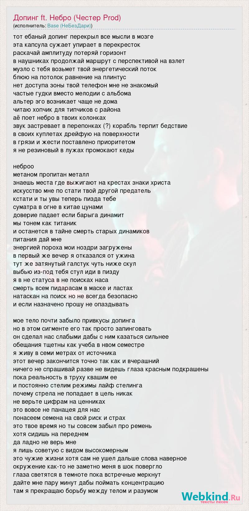 тот ебаный допинг перекрыл все мысли в мозге эта капсула сужает упирает в перекресток раскачай амплитуду потеряй горизонт в наушниках продолжай маршрут с перспективой на взлет музло с тебя возьмет твой энергетический поток блюю на потолок равнение на плинтус нет доступа зоны твой телефон мне не знакомый частые гудки вместо мелодии с альбома альтер эго возникает чаще не дома читаю хопчик для типчиков с района аё поет небро в твоих колонках звук застревает в перепонках (?) корабль терпит бедствие в своих куплетах дрейфую на поверхности в грязи и жести поставлено приоритетом я не резиновый в лужах промокают кеды неброо метаном пропитан металл знаешь места где выжигают на крестах знаки христа искусство мне по стати твой другой предатель кстати и ты увы теперь пизда тебе суматра в огне в китае цунами доверие падает если барыга динамит мы тонем как титаник и останется в тайне смерть старых динамиков питания дай мне энергией пороха мои ноздри загружены в первый же вечер я отказался от ужина тут же затянутый галстук чуть ниже скул выбью из-под тебя стул иди в пизду я в не статуса в не поисках наса смерть всем пидарасам в маске и ластах натаскан на поиск но не всегда безопасно и если назначено прошу не опаздывать мое тело почти забыло привкусы допинга но в этом сигменте его так просто запинговать он сделал нас слабыми дабы с ним казаться сильнее обещания тщетны как учеба в нвом семестре я живу в семи метрах от источника этот вечер закончится точно так как и вчерашний ничего не спрашивай разве не видешь глаза красным подкрашены пока реальность в труху квашим ее и постоянно стелим режимы лайф стелинга почему стрела не попадает в цель никак не верьте цифрам на ценниках это вовсе не панацея для нас понасеем семена на свой риск и страх это твое время но ты совсем забыл про ремень хотя сидишь на переднем да ладно не верь мне я лишь советую с видом высокомерным это чужие жизни хотя сам не ушел дальше слова наверное окружение как-то не заметно меня в шок повергло глаза светятся в темноте пока встречные меркнут дайте мне пару минут дабы поймать концентрацию там я прекращаю борьбу между телом и разумом