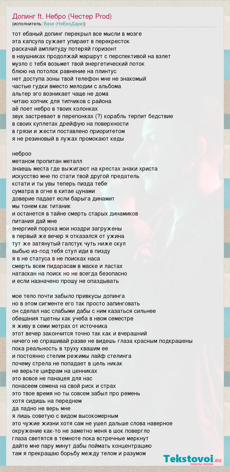 тот ебаный допинг перекрыл все мысли в мозге эта капсула сужает упирает в перекресток раскачай амплитуду потеряй горизонт в наушниках продолжай маршрут с перспективой на взлет музло с тебя возьмет твой энергетический поток блюю на потолок равнение на плинтус нет доступа зоны твой телефон мне не знакомый частые гудки вместо мелодии с альбома альтер эго возникает чаще не дома читаю хопчик для типчиков с района аё поет небро в твоих колонках звук застревает в перепонках (?) корабль терпит бедствие в своих куплетах дрейфую на поверхности в грязи и жести поставлено приоритетом я не резиновый в лужах промокают кеды неброо метаном пропитан металл знаешь места где выжигают на крестах знаки христа искусство мне по стати твой другой предатель кстати и ты увы теперь пизда тебе суматра в огне в китае цунами доверие падает если барыга динамит мы тонем как титаник и останется в тайне смерть старых динамиков питания дай мне энергией пороха мои ноздри загружены в первый же вечер я отказался от ужина тут же затянутый галстук чуть ниже скул выбью из-под тебя стул иди в пизду я в не статуса в не поисках наса смерть всем пидарасам в маске и ластах натаскан на поиск но не всегда безопасно и если назначено прошу не опаздывать мое тело почти забыло привкусы допинга но в этом сигменте его так просто запинговать он сделал нас слабыми дабы с ним казаться сильнее обещания тщетны как учеба в нвом семестре я живу в семи метрах от источника этот вечер закончится точно так как и вчерашний ничего не спрашивай разве не видешь глаза красным подкрашены пока реальность в труху квашим ее и постоянно стелим режимы лайф стелинга почему стрела не попадает в цель никак не верьте цифрам на ценниках это вовсе не панацея для нас понасеем семена на свой риск и страх это твое время но ты совсем забыл про ремень хотя сидишь на переднем да ладно не верь мне я лишь советую с видом высокомерным это чужие жизни хотя сам не ушел дальше слова наверное окружение как-то не заметно меня в шок повергло глаза светятся в темноте пока встречные меркнут дайте мне пару минут дабы поймать концентрацию там я прекращаю борьбу между телом и разумом