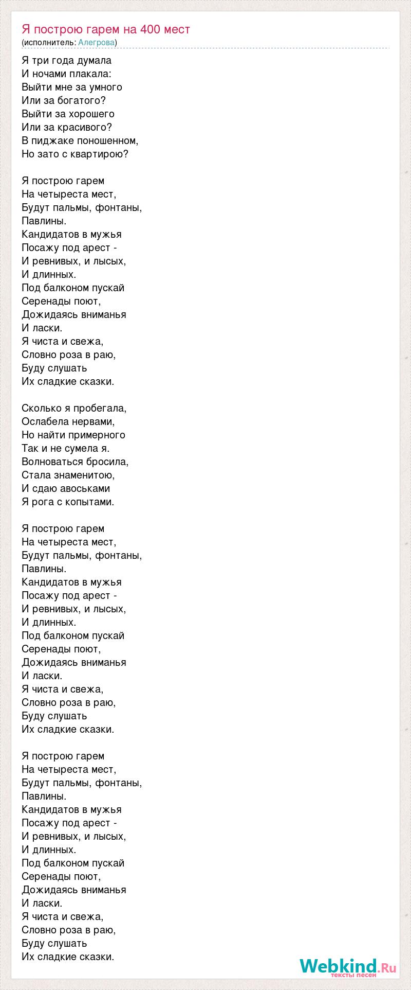 Я три года думала И ночами плакала: Выйти мне за умного Или за богатого? Выйти за хорошего Или за красивого? В пиджаке поношенном, Но зато с квартирою? Я построю гарем На четыреста мест, Будут пальмы, фонтаны, Павлины. Кандидатов в мужья Посажу под арест - И ревнивых, и лысых, И длинных. Под балконом пускай Серенады поют, Дожидаясь вниманья И ласки. Я чиста и свежа, Словно роза в раю, Буду слушать Их сладкие сказки. Сколько я пробегала, Ослабела нервами, Но найти примерного Так и не сумела я. Волноваться бросила, Стала знаменитою, И сдаю авоськами Я рога с копытами. Я построю гарем На четыреста мест, Будут пальмы, фонтаны, Павлины. Кандидатов в мужья Посажу под арест - И ревнивых, и лысых, И длинных. Под балконом пускай Серенады поют, Дожидаясь вниманья И ласки. Я чиста и свежа, Словно роза в раю, Буду слушать Их сладкие сказки. Я построю гарем На четыреста мест, Будут пальмы, фонтаны, Павлины. Кандидатов в мужья Посажу под арест - И ревнивых, и лысых, И длинных. Под балконом пускай Серенады поют, Дожидаясь вниманья И ласки. Я чиста и свежа, Словно роза в раю, Буду слушать Их сладкие сказки.