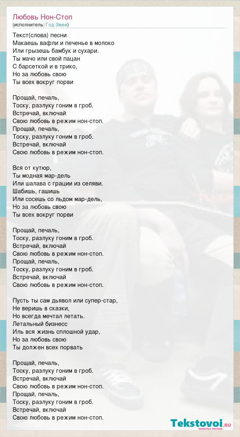 Текст(слова) песни Макаешь вафли и печенье в молоко Или грызешь бамбук и сухари. Ты мачо или свой пацан С барсеткой и в трико, Но за любовь свою Ты всех вокруг порви Прощай, печаль, Тоску, разлуку гоним в гроб. Встречай, включай Свою любовь в режим нон-стоп. Прощай, печаль, Тоску, разлуку гоним в гроб. Встречай, включай Свою любовь в режим нон-стоп. Вся от кутюр, Ты модная мар-дель Или шалава с грации из селяви. Шабишь, гашишь Или сосешь со льдом мар-дель, Но за любовь свою Ты всех вокруг порви Прощай, печаль, Тоску, разлуку гоним в гроб. Встречай, включай Свою любовь в режим нон-стоп. Прощай, печаль, Тоску, разлуку гоним в гроб. Встречай, включай Свою любовь в режим нон-стоп. Пусть ты сам дьявол или супер-стар, Не веришь в сказки, Но всегда мечтал летать. Летальный бизнесс Иль вся жизнь сплошной удар, Но за любовь свою Ты должен всех порвать Прощай, печаль, Тоску, разлуку гоним в гроб. Встречай, включай Свою любовь в режим нон-стоп. Прощай, печаль, Тоску, разлуку гоним в гроб. Встречай, включай Свою любовь в режим нон-стоп.