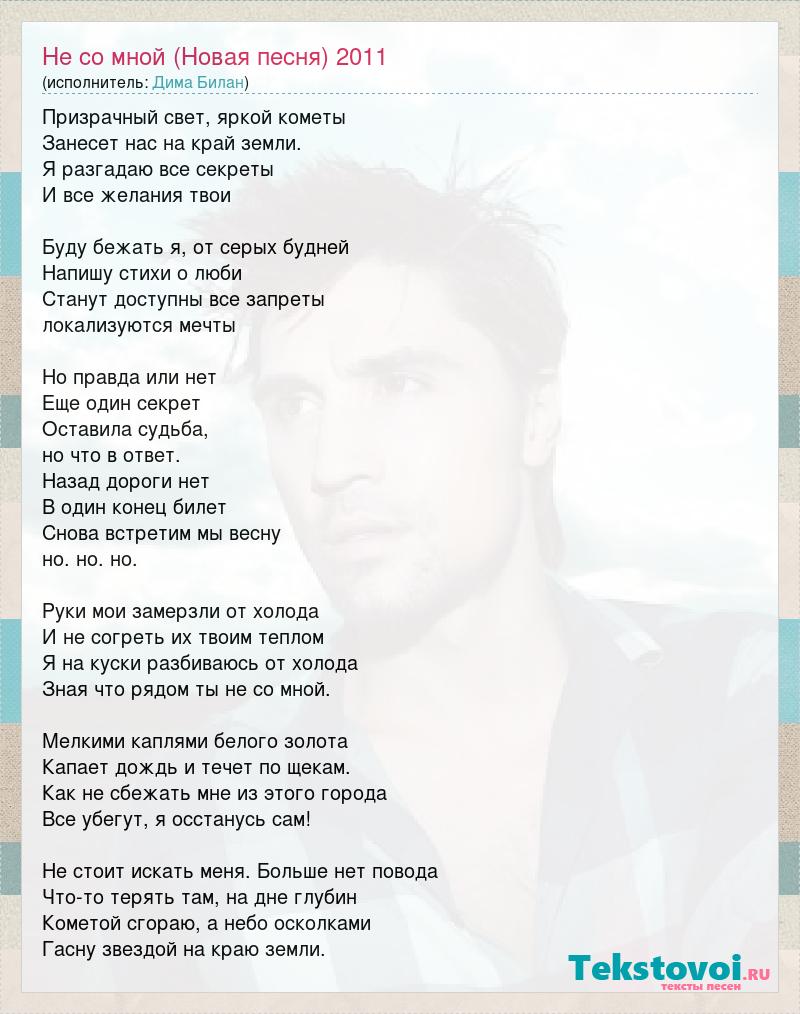 Призрачный свет, яркой кометы Занесет нас на край земли. Я разгадаю все секреты И все желания твои Буду бежать я, от серых будней Напишу стихи о люби Станут доступны все запреты локализуются мечты Но правда или нет Еще один секрет Оставила судьба, но что в ответ. Назад дороги нет В один конец билет Снова встретим мы весну но. но. но. Руки мои замерзли от холода И не согреть их твоим теплом Я на куски разбиваюсь от холода Зная что рядом ты не со мной. Мелкими каплями белого золота Капает дождь и течет по щекам. Как не сбежать мне из этого города Все убегут, я осстанусь сам! Не стоит искать меня. Больше нет повода Что-то терять там, на дне глубин Кометой сгораю, а небо осколками Гасну звездой на краю земли.