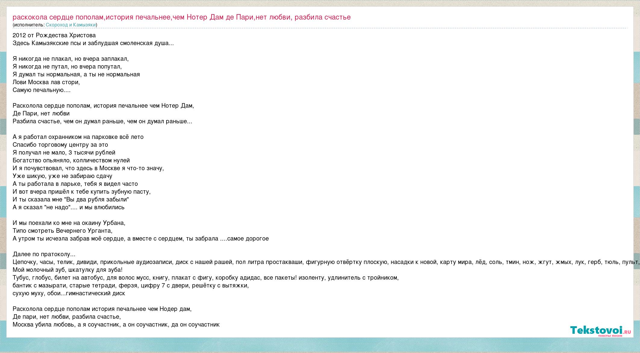2012 от Рождества Христова Здесь Камызякские псы и заблудшая смоленская душа... Я никогда не плакал, но вчера заплакал, Я никогда не путал, но вчера попутал, Я думал ты нормальная, а ты не нормальная Лови Москва лав стори, Самую печальную.... Расколола сердце пополам, история печальнее чем Нотер Дам, Де Пари, нет любви Разбила счастье, чем он думал раньше, чем он думал раньше... А я работал охранником на парковке всё лето Спасибо торговому центру за это Я получал не мало, 3 тысячи рублей Богатство опьяняло, колличеством нулей И я почувствовал, что здесь в Москве я что-то значу, Уже шикую, уже не забираю сдачу А ты работала в ларьке, тебя я видел часто И вот вчера пришёл к тебе купить зубную пасту, И ты сказала мне "Вы два рубля забыли" А я сказал "не надо".... и мы влюбились И мы поехали ко мне на окаину Урбана, Типо смотреть Вечернего Урганта, А утром ты исчезла забрав моё сердце, а вместе с сердцем, ты забрала ....самое дорогое Далее по пратоколу... Цепочку, часы, телик, дивиди, прикольные аудиозаписи, диск с нашей рашей, пол литра простакваши, фигурную отвёртку плоскую, насадки к новой, карту мира, лёд, соль, тмин, нож, жгут, жмых, лук, герб, тюль, пульт, Мой молочный зуб, шкатулку для зуба! Тубус, глобус, билет на автобус, для волос мусс, книгу, плакат с фигу, коробку адидас, все пакеты! изоленту, удлинитель с тройником, бантик с мазырати, старые тетради, ферзя, цифру 7 с двери, решётку с вытяжки, сухую муху, обои...гимнастический диск Расколола сердце пополам история печальнее чем Нодер дам, Де пари, нет любви, разбила счастье, Москва убила любовь, а я соучастник, а он соучастник, да он соучастник