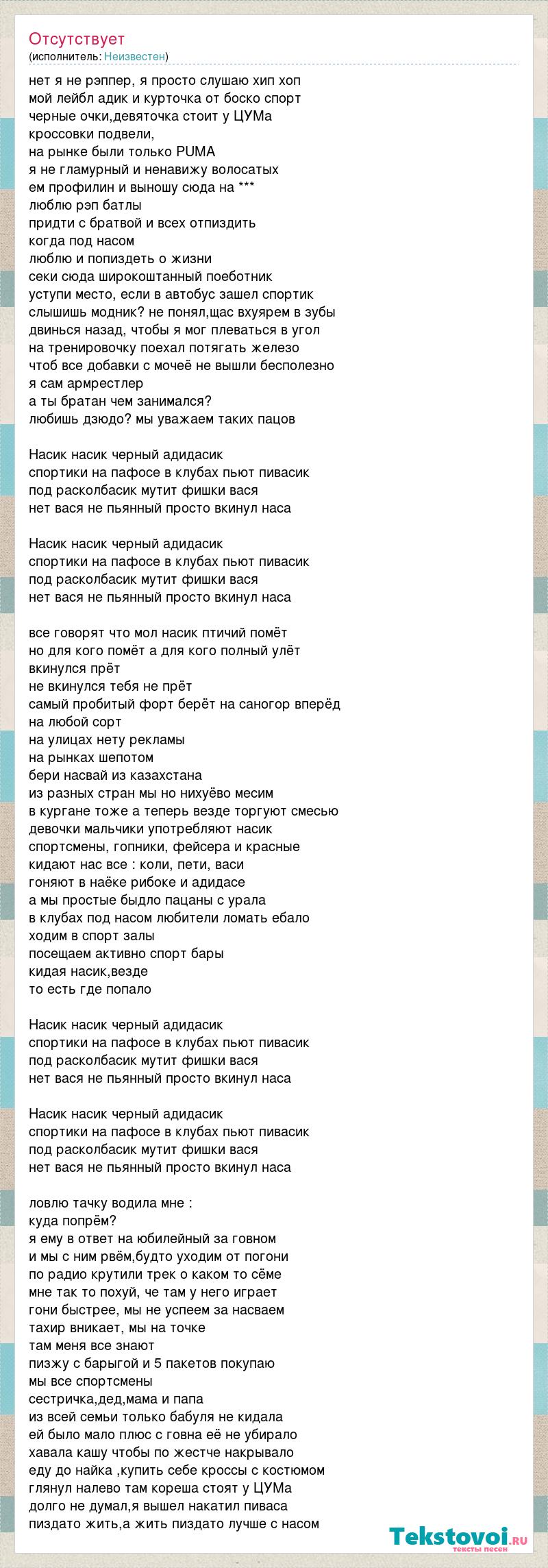 нет я не рэппер, я просто слушаю хип хоп мой лейбл адик и курточка от боско спорт черные очки,девяточка стоит у ЦУМа кроссовки подвели, на рынке были только PUMA я не гламурный и ненавижу волосатых ем профилин и выношу сюда на *** люблю рэп батлы придти с братвой и всех отпиздить когда под насом люблю и попиздеть о жизни секи сюда широкоштанный поеботник уступи место, если в автобус зашел спортик слышишь модник? не понял,щас вхуярем в зубы двинься назад, чтобы я мог плеваться в угол на тренировочку поехал потягать железо чтоб все добавки с мочеё не вышли бесполезно я сам армрестлер а ты братан чем занимался? любишь дзюдо? мы уважаем таких пацов Насик насик черный адидасик спортики на пафосе в клубах пьют пивасик под расколбасик мутит фишки вася нет вася не пьянный просто вкинул наса Насик насик черный адидасик спортики на пафосе в клубах пьют пивасик под расколбасик мутит фишки вася нет вася не пьянный просто вкинул наса все говорят что мол насик птичий помёт но для кого помёт а для кого полный улёт вкинулся прёт не вкинулся тебя не прёт самый пробитый форт берёт на саногор вперёд на любой сорт на улицах нету рекламы на рынках шепотом бери насвай из казахстана из разных стран мы но нихуёво месим в кургане тоже а теперь везде торгуют смесью девочки мальчики употребляют насик спортсмены, гопники, фейсера и красные кидают нас все : коли, пети, васи гоняют в наёке рибоке и адидасе а мы простые быдло пацаны с урала в клубах под насом любители ломать ебало ходим в спорт залы посещаем активно спорт бары кидая насик,везде то есть где попало Насик насик черный адидасик спортики на пафосе в клубах пьют пивасик под расколбасик мутит фишки вася нет вася не пьянный просто вкинул наса Насик насик черный адидасик спортики на пафосе в клубах пьют пивасик под расколбасик мутит фишки вася нет вася не пьянный просто вкинул наса ловлю тачку водила мне : куда попрём? я ему в ответ на юбилейный за говном и мы с ним рвём,будто уходим от погони по радио крутили трек о каком то сёме мне так то похуй, че там у него играет гони быстрее, мы не успеем за насваем тахир вникает, мы на точке там меня все знают пизжу с барыгой и 5 пакетов покупаю мы все спортсмены сестричка,дед,мама и папа из всей семьи только бабуля не кидала ей было мало плюс с говна её не убирало хавала кашу чтобы по жестче накрывало еду до найка ,купить себе кроссы с костюмом глянул налево там кореша стоят у ЦУМа долго не думал,я вышел накатил пиваса пиздато жить,а жить пиздато лучше с насом