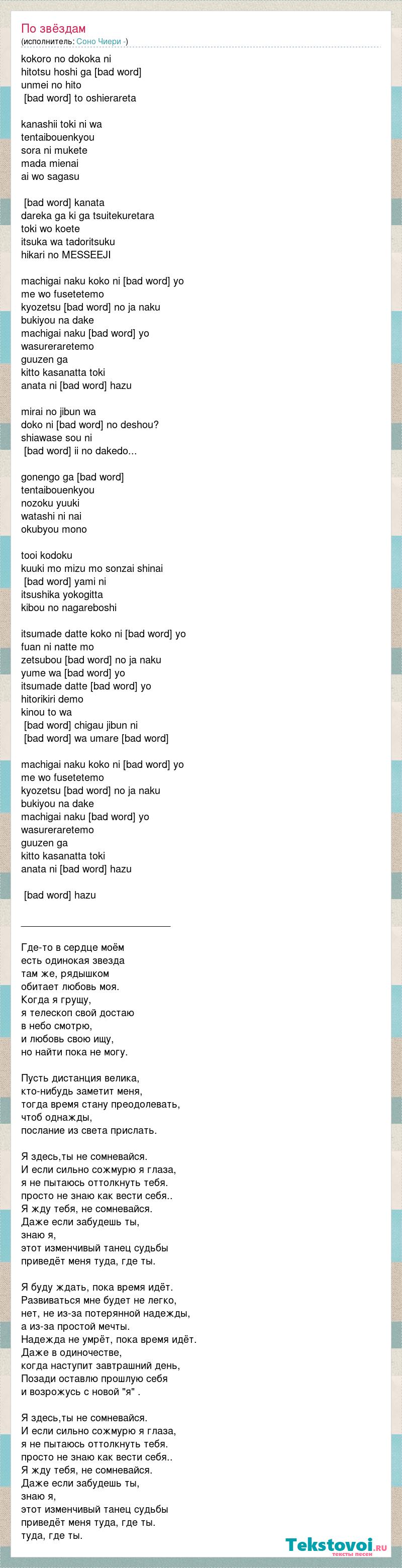 kokoro no dokoka ni hitotsu hoshi ga aru unmei no hito sundeiru to oshierareta kanashii toki ni wa tentaibouenkyou sora ni mukete mada mienai ai wo sagasu haruka kanata dareka ga ki ga tsuitekuretara toki wo koete itsuka wa tadoritsuku hikari no MESSEEJI machigai naku koko ni iru yo me wo fusetetemo kyozetsu [bad word] no ja naku bukiyou na dake machigai naku matteiru yo wasureraretemo guuzen ga kitto kasanatta toki anata ni aeru hazu mirai no jibun wa doko ni iru no deshou? shiawase sou ni [bad word] ii no dakedo... gonengo ga mieru tentaibouenkyou nozoku yuuki watashi ni nai okubyou mono tooi kodoku kuuki mo mizu mo sonzai shinai [bad word] yami ni itsushika yokogitta kibou no nagareboshi itsumade datte koko ni iru yo fuan ni natte mo zetsubou [bad word] no ja naku yume wa miteru yo itsumade datte shinjiteru yo hitorikiri demo kinou to wa marude chigau jibun ni [bad word] wa umare kawaru machigai naku koko ni iru yo me wo fusetetemo kyozetsu [bad word] no ja naku bukiyou na dake machigai naku matteiru yo wasureraretemo guuzen ga kitto kasanatta toki anata ni aeru hazu aeru hazu ___________________________ Где-то в сердце моём есть одинокая звезда там же, рядышком обитает любовь моя. Когда я грущу, я телескоп свой достаю в небо смотрю, и любовь свою ищу, но найти пока не могу. Пусть дистанция велика, кто-нибудь заметит меня, тогда время стану преодолевать, чтоб однажды, послание из света прислать. Я здесь,ты не сомневайся. И если сильно сожмурю я глаза, я не пытаюсь оттолкнуть тебя. просто не знаю как вести себя.. Я жду тебя, не сомневайся. Даже если забудешь ты, знаю я, этот изменчивый танец судьбы приведёт меня туда, где ты. Я буду ждать, пока время идёт. Развиваться мне будет не легко, нет, не из-за потерянной надежды, а из-за простой мечты. Надежда не умрёт, пока время идёт. Даже в одиночестве, когда наступит завтрашний день, Позади оставлю прошлую себя и возрожусь с новой "я" . Я здесь,ты не сомневайся. И если сильно сожмурю я глаза, я не пытаюсь оттолкнуть тебя. просто не знаю как вести себя.. Я жду тебя, не сомневайся. Даже если забудешь ты, знаю я, этот изменчивый танец судьбы приведёт меня туда, где ты. туда, где ты.
