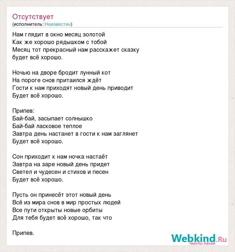 Нам глядит в окно месяц золотой Как же хорошо рядышком с тобой Месяц тот прекрасный нам расскажет сказку будет всё хорошо. Ночью на дворе бродит лунный кот На пороге снов притаился ждёт Гости к нам приходят новый день приводит Будет всё хорошо. Припев: Бай-бай, засыпает солнышко Бай-бай ласковое теплое Завтра день настанет в гости к нам заглянет Будет всё хорошо. Сон приходит к нам ночка настаёт Завтра на заре новый день придет Светел и чудесен и стихов и песен Будет всё хорошо. Пусть он принесёт этот новый день Всё из мира снов в мир простых людей Все пути открыты новые орбиты Для тебя будет всё хорошо, так что Припев.
