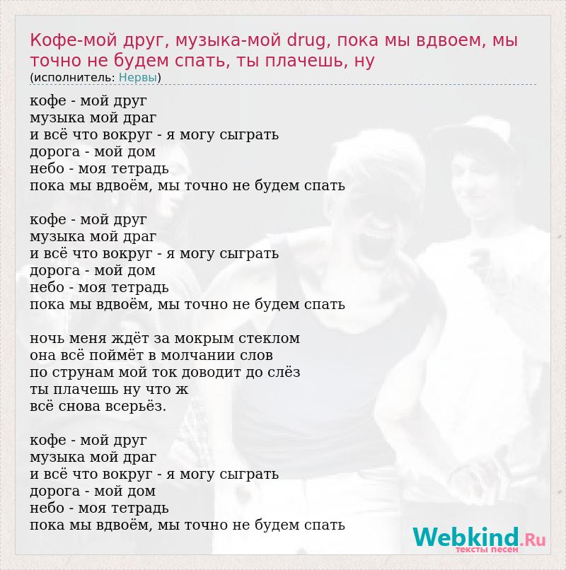 кофе - мой друг музыка мой драг и всё что вокруг - я могу сыграть дорога - мой дом небо - моя тетрадь пока мы вдвоём, мы точно не будем спать кофе - мой друг музыка мой драг и всё что вокруг - я могу сыграть дорога - мой дом небо - моя тетрадь пока мы вдвоём, мы точно не будем спать ночь меня ждёт за мокрым стеклом она всё поймёт в молчании слов по струнам мой ток доводит до слёз ты плачешь ну что ж всё снова всерьёз. кофе - мой друг музыка мой драг и всё что вокруг - я могу сыграть дорога - мой дом небо - моя тетрадь пока мы вдвоём, мы точно не будем спать