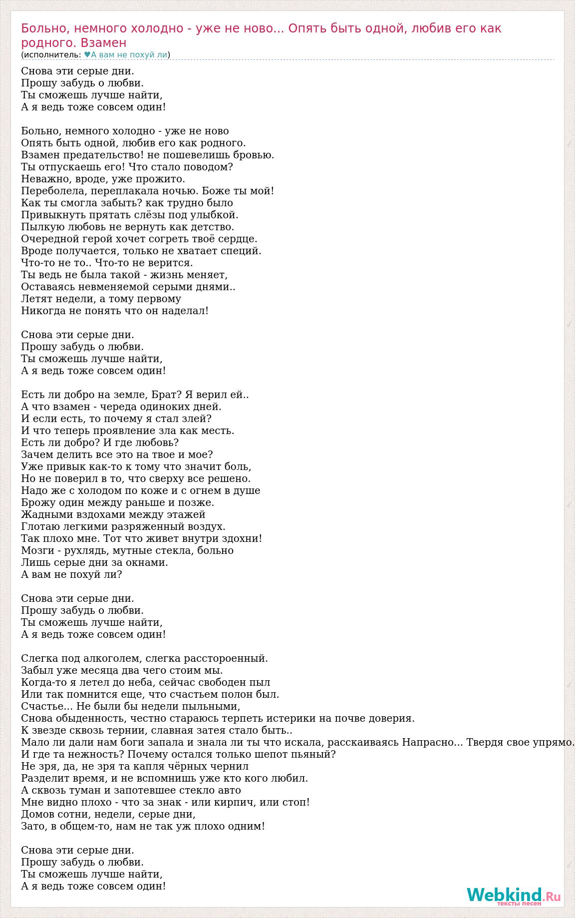 Главная→Исполнители→♥А вам не похуй ли→Больно, немного холодно - уже не ново... Опять быть одной, любив его как родного
