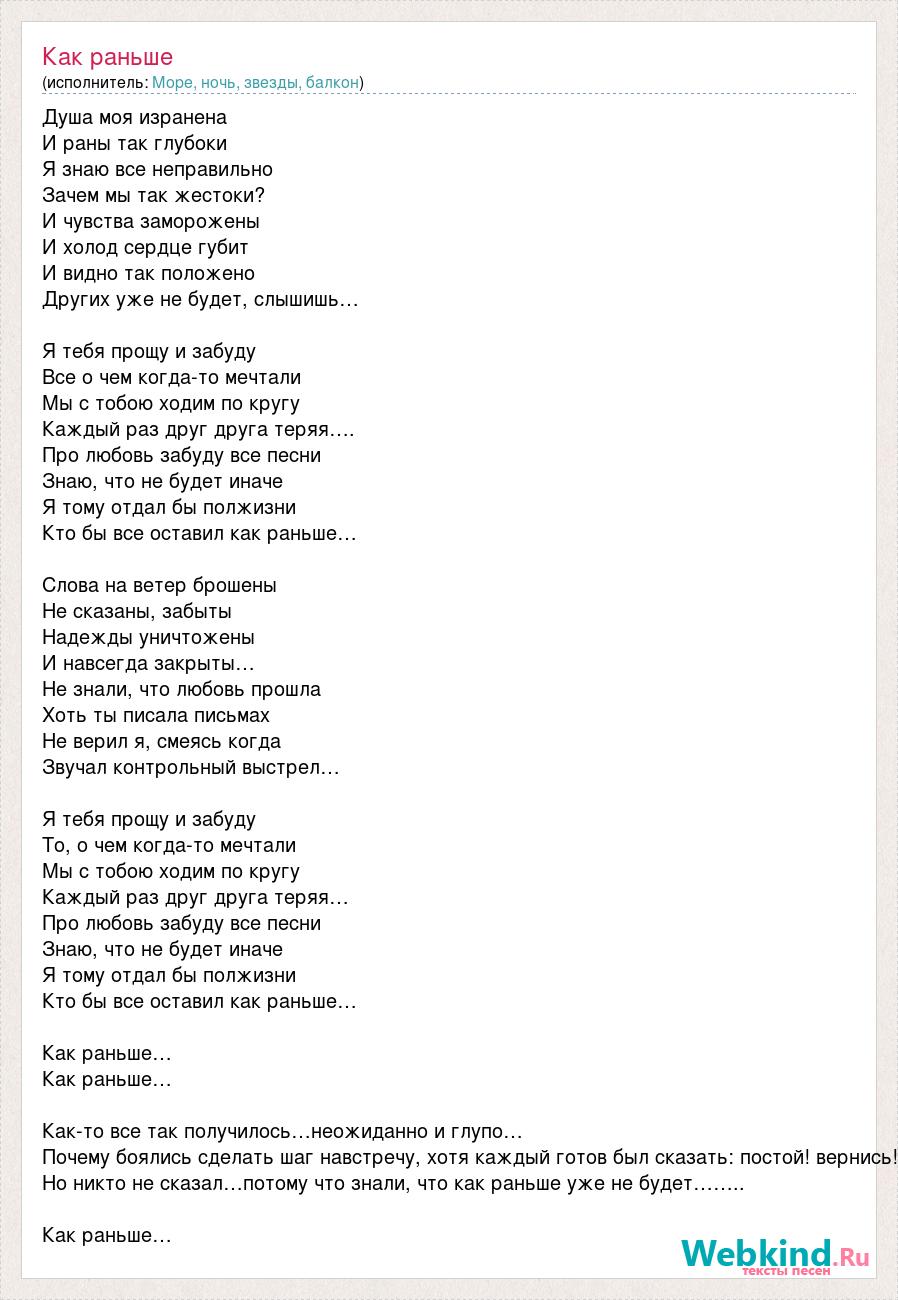 Душа моя изранена И раны так глубоки Я знаю все неправильно Зачем мы так жестоки? И чувства заморожены И холод сердце губит И видно так положено Других уже не будет, слышишь… Я тебя прощу и забуду Все о чем когда-то мечтали Мы с тобою ходим по кругу Каждый раз друг друга теряя…. Про любовь забуду все песни Знаю, что не будет иначе Я тому отдал бы полжизни Кто бы все оставил как раньше… Слова на ветер брошены Не сказаны, забыты Надежды уничтожены И навсегда закрыты… Не знали, что любовь прошла Хоть ты писала письмах Не верил я, смеясь когда Звучал контрольный выстрел… Я тебя прощу и забуду То, о чем когда-то мечтали Мы с тобою ходим по кругу Каждый раз друг друга теряя… Про любовь забуду все песни Знаю, что не будет иначе Я тому отдал бы полжизни Кто бы все оставил как раньше… Как раньше… Как раньше… Как-то все так получилось…неожиданно и глупо… Почему боялись сделать шаг навстречу, хотя каждый готов был сказать: постой! вернись! Но никто не сказал…потому что знали, что как раньше уже не будет…….. Как раньше…