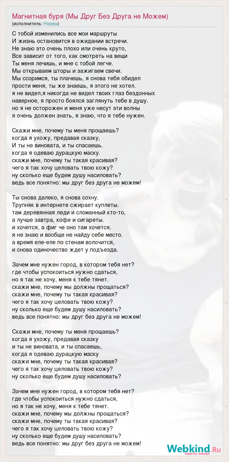 С тобой изменились все мои маршруты И жизнь остановится в ожидании встречи. Не знаю это очень плохо или очень круто, Все зависит от того, как смотреть на вещи Ты меня лечишь, и мне с тобой легче. Мы открываем шторы и зажигаем свечи. Мы ссоримся, ты плачешь, я снова тебя обидел прости меня, ты же знаешь, я этого не хотел. я не видел,я никогда не видел твоих глаз бездонных наверное, я просто боялся заглянуть тебе в душу. но я не осторожен и меня уже несут эти волны я очень должен знать, я знаю, что я тебе нужен. Скажи мне, почему ты меня прощаешь? когда я ухожу, предавая сказку, И ты не виновата, и ты спасаешь. когда я одеваю дурацкую маску. скажи мне, почему ты такая красивая? чего я так хочу целовать твою кожу? ну сколько еще будем душу насиловать? ведь все понятно: мы друг без друга не можем! Ты снова далеко, я снова сохну. Трупняк в интернете сжирает куплеты. там деревянная леди и сломанный кто-то, а лучше завтра, кофе и сигареты. и хочется, а фиг че оно там хочется. я не знаю и вообще не найду себе место. а время еле-еле по стенам волочится, и снова одиночество ждет у подъезда. Зачем мне нужен город, в котором тебя нет? где чтобы успокоиться нужно сдаться, но я так не хочу, меня к тебе тянет. скажи мне, почему мы должны прощаться? скажи мне, почему ты такая красивая? чего я так хочу целовать твою кожу? ну сколько еще будем душу насиловать? ведь все понятно: мы друг без друга не можем! Скажи мне, почему ты меня прощаешь? когда я ухожу, предавая сказку и ты не виновата, и ты спасаешь, когда я одеваю дурацкую маску скажи мне, почему ты такая красивая? чего я так хочу целовать твою кожу? ну сколько еще будем душу насиловать? Зачем мне нужен город, в котором тебя нет? где чтобы успокоиться нужно сдаться, но я так не хочу, меня к тебе тянет. скажи мне, почему мы должны прощаться? скажи мне, почему ты такая красивая? чего я так хочу целовать твою кожу? ну сколько еще будем душу насиловать? ведь все понятно: мы друг без друга не можем!