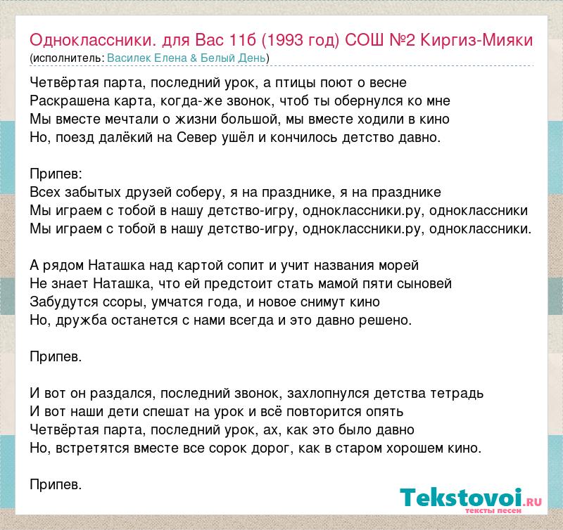 Четвёртая парта, последний урок, а птицы поют о весне Раскрашена карта, когда-же звонок, чтоб ты обернулся ко мне Мы вместе мечтали о жизни большой, мы вместе ходили в кино Но, поезд далёкий на Север ушёл и кончилось детство давно. Припев: Всех забытых друзей соберу, я на празднике, я на празднике Мы играем с тобой в нашу детство-игру, одноклассники.ру, одноклассники Мы играем с тобой в нашу детство-игру, одноклассники.ру, одноклассники. А рядом Наташка над картой сопит и учит названия морей Не знает Наташка, что ей предстоит стать мамой пяти сыновей Забудутся ссоры, умчатся года, и новое снимут кино Но, дружба останется с нами всегда и это давно решено. Припев. И вот он раздался, последний звонок, захлопнулся детства тетрадь И вот наши дети спешат на урок и всё повторится опять Четвёртая парта, последний урок, ах, как это было давно Но, встретятся вместе все сорок дорог, как в старом хорошем кино. Припев.