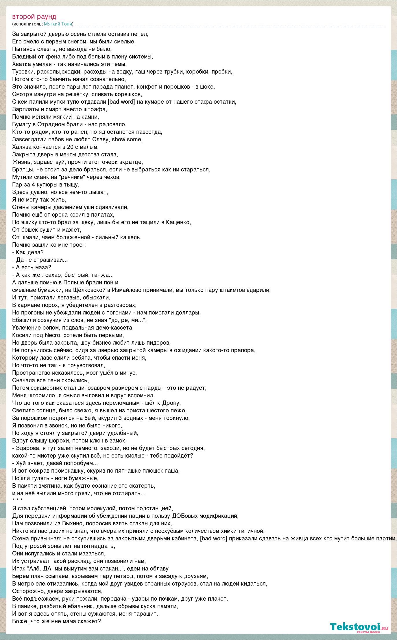 За закрытой дверью осень стлела оставив пепел, Его смело с первым снегом, мы были смелые, Пытаясь слезть, но выхода не было, Бледный от фена либо под белым в плену системы, Хватка умелая - так начинались эти темы, Тусовки, расколы,сходки, расходы на водку, гаш через трубки, коробки, пробки, Потом кто-то банчить начал сознательно, Это значило, после пары лет парада планет, конфет и порошков - в шоке, Смотря изнутри на решётку, сливать корешков, С кем палили мутки тупо отдавали [bad word] на кумаре от нашего стафа остатки, Зарплаты и смарт вместо штрафа, Помню меняли мягкий на камни, Бумагу в Отрадном брали - нас радовало, Кто-то рядом, кто-то ранен, но яд останется навсегда, Завсегдатаи пабов не любят Славу, show some, Халява кончается в 20 с малым, Закрыта дверь в мечты детства стала, Жизнь, здравствуй, прочти этот очерк вкратце, Братцы, не стоит за дело браться, если не выбраться как ни стараться, Мутили сканк на "речнике" через чехов, Гар за 4 купюры в тыщу, Здесь душно, но все чем-то дышат, Я не могу так жить, Стены камеры давлением уши сдавливали, Помню ещё от срока косил в палатах, По ящику кто-то брал за щеку, лишь бы его не тащили в Кащенко, От бошек сушит и мажет, От шмали, чаем бодяженной - сильный кашель, Помню зашли ко мне трое : - Как дела? - Да не спрашивай... - А есть маза? - А как же : сахар, быстрый, ганжа... А дальше помню в Польше брали пон и смешные бумажки, на Щёлковской в Измайлово принимали, мы только пару штакетов вдарили, И тут, пристали легавые, обыскали, В кармане порох, я убедителен в разговорах, Но прогоны не убеждали людей c погонами - нам помогали доллары, Ебашили созвучия из слов, не зная "до, ре, ми...", Увлечение рэпом, подвальная демо-кассета, Косили под Necro, хотели быть первыми, Но дверь была закрыта, шоу-бизнес любит лишь пидоров, Не получилось сейчас, сидя за дверью закрытой камеры в ожидании какого-то прапора, Которому лаве слили ребята, чтобы спасти меня, Но что-то не так - я почувствовал, Пространство исказилось, мозг ушёл в минус, Сначала все тени скрылись, Потом сокамерник стал динозавром размером с нарды - это не радует, Меня штормило, я смысл выловил и вдруг вспомнил, Что до того как оказаться здесь переломаным - шёл к Дрону, Светило солнце, было свежо, я вышел из триста шестого пежо, За порошком поднялся на 5ый, вкурил 3 водных - меня торкнуло, Я позвонил в звонок, но не было никого, По ходу я стоял у закрытой двери удолбаный, Вдруг слышу шорохи, потом ключ в замок, - Здарова, я тут залип немного, заходи, но не будет быстрых сегодня, какой-то мистер уже скупил всё, но есть кислые - тебе подойдёт? - Хуй знает, давай попробуем... И вот сожрав промокашку, скурив по пятнашке плюшек гаша, Пошли гулять - ноги бумажные, В памяти вмятина, как будто сознание это скатерть, и на неё вылили много грязи, что не отстирать... * * * Я стал субстанцией, потом молекулой, потом подстанцией, Для передачи информации об убеждении нации в пользу ДОБовых модификаций, Нам позвонили из Выхино, попросив взять стакан для них, Никто из нас двоих не знал, что вчера их приняли с несхуёвым количеством химки типичной, Схема привычная: не откупившись за закрытыми дверьми кабинета, [bad word] приказали сдавать на живца всех кто мутит большие партии, Под угрозой зоны лет на пятнадцать, Они испугались и стали мазаться, Их устраивал такой расклад, они позвонили нам, Итак "Алё, ДА, мы вымутим вам стакан..", едем на обла