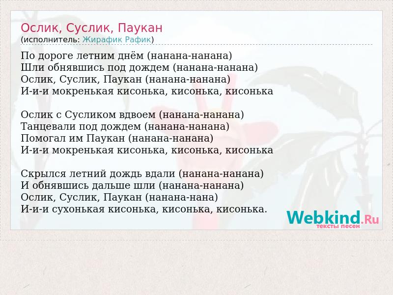 По дороге летним днём (нанана-нанана) Шли обнявшись под дождем (нанана-нанана) Ослик, Суслик, Паукан (нанана-нанана) И-и-и мокренькая кисонька, кисонька, кисонька Ослик с Сусликом вдвоем (нанана-нанана) Танцевали под дождем (нанана-нанана) Помогал им Паукан (нанана-нанана) И-и-и мокренькая кисонька, кисонька, кисонька Скрылся летний дождь вдали (нанана-нанана) И обнявшись дальше шли (нанана-нанана) Ослик, Суслик, Паукан (нанана-нана) И-и-и сухонькая кисонька, кисонька, кисонька.