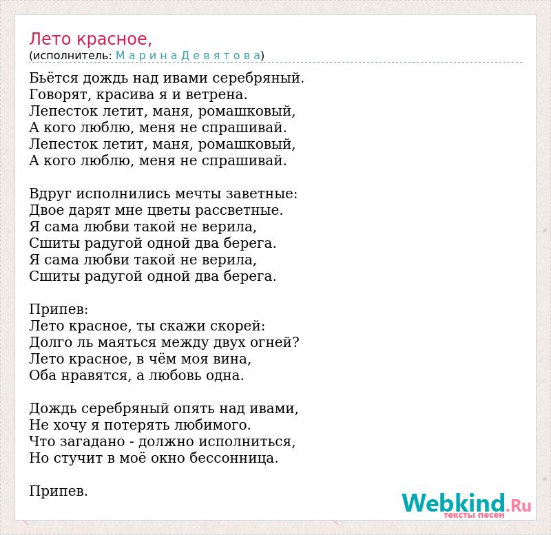 Бьётся дождь над ивами серебряный. Говорят, красива я и ветрена. Лепесток летит, маня, ромашковый, А кого люблю, меня не спрашивай. Лепесток летит, маня, ромашковый, А кого люблю, меня не спрашивай. Вдруг исполнились мечты заветные: Двое дарят мне цветы рассветные. Я сама любви такой не верила, Сшиты радугой одной два берега. Я сама любви такой не верила, Сшиты радугой одной два берега. Припев: Лето красное, ты скажи скорей: Долго ль маяться между двух огней? Лето красное, в чём моя вина, Оба нравятся, а любовь одна. Дождь серебряный опять над ивами, Не хочу я потерять любимого. Что загадано - должно исполниться, Но стучит в моё окно бессонница. Припев.