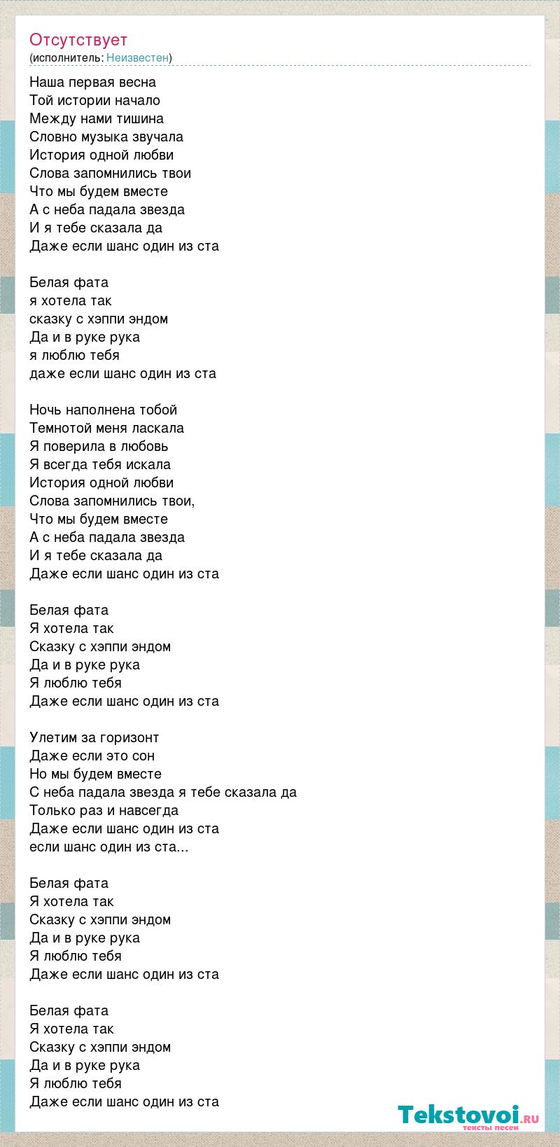 Наша первая весна Той истории начало Между нами тишина Словно музыка звучала История одной любви Слова запомнились твои Что мы будем вместе А с неба падала звезда И я тебе сказала да Даже если шанс один из ста Белая фата я хотела так сказку с хэппи эндом Да и в руке рука я люблю тебя даже если шанс один из ста Ночь наполнена тобой Темнотой меня ласкала Я поверила в любовь Я всегда тебя искала История одной любви Слова запомнились твои, Что мы будем вместе А с неба падала звезда И я тебе сказала да Даже если шанс один из ста Белая фата Я хотела так Сказку с хэппи эндом Да и в руке рука Я люблю тебя Даже если шанс один из ста Улетим за горизонт Даже если это сон Но мы будем вместе С неба падала звезда я тебе сказала да Только раз и навсегда Даже если шанс один из ста если шанс один из ста... Белая фата Я хотела так Сказку с хэппи эндом Да и в руке рука Я люблю тебя Даже если шанс один из ста Белая фата Я хотела так Сказку с хэппи эндом Да и в руке рука Я люблю тебя Даже если шанс один из ста
