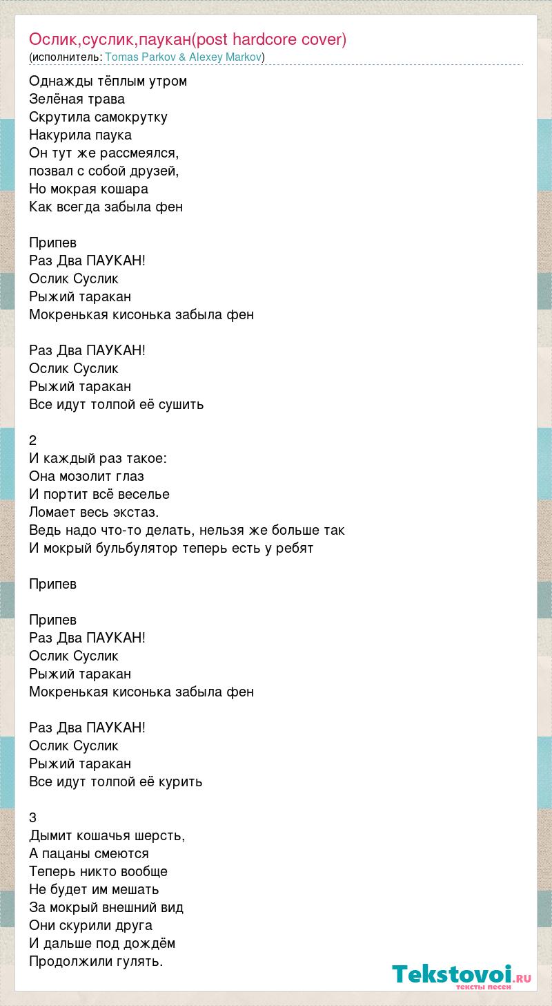 Однажды тёплым утром Зелёная трава Скрутила самокрутку Накурила паука Он тут же рассмеялся, позвал с собой друзей, Но мокрая кошара Как всегда забыла фен Припев Раз Два ПАУКАН! Ослик Суслик Рыжий таракан Мокренькая кисонька забыла фен Раз Два ПАУКАН! Ослик Суслик Рыжий таракан Все идут толпой её сушить 2 И каждый раз такое: Она мозолит глаз И портит всё веселье Ломает весь экстаз. Ведь надо что-то делать, нельзя же больше так И мокрый бульбулятор теперь есть у ребят Припев Припев Раз Два ПАУКАН! Ослик Суслик Рыжий таракан Мокренькая кисонька забыла фен Раз Два ПАУКАН! Ослик Суслик Рыжий таракан Все идут толпой её курить 3 Дымит кошачья шерсть, А пацаны смеются Теперь никто вообще Не будет им мешать За мокрый внешний вид Они скурили друга И дальше под дождём Продолжили гулять.