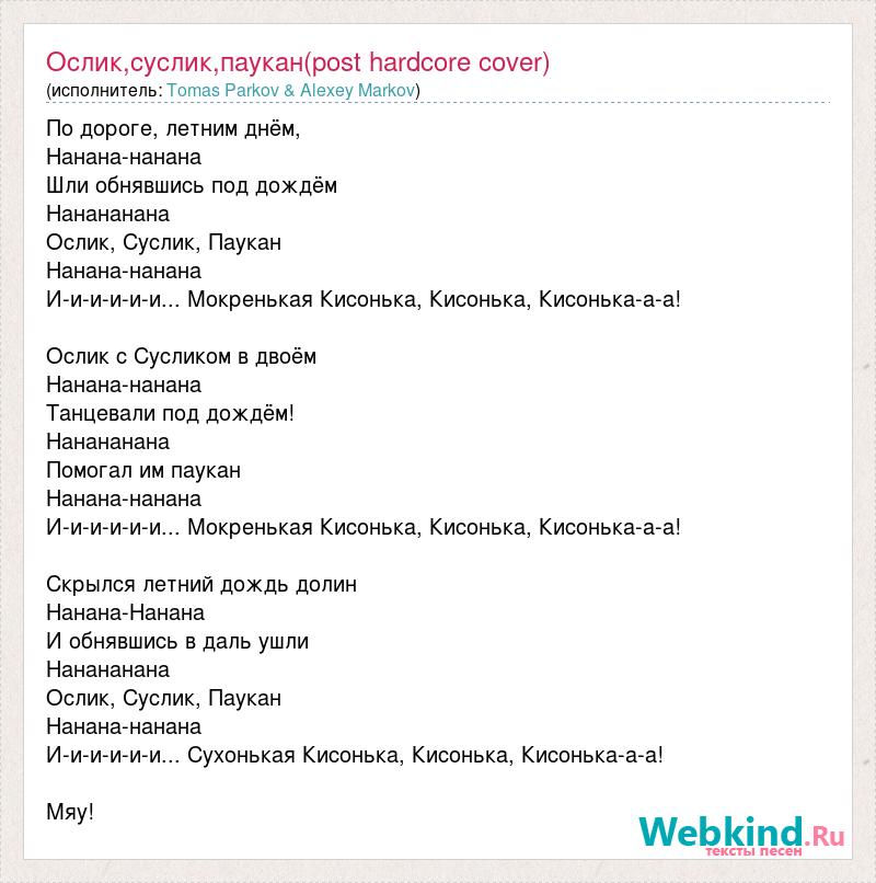 По дороге, летним днём, Нанана-нанана Шли обнявшись под дождём Нанананана Ослик, Суслик, Паукан Нанана-нанана И-и-и-и-и-и... Мокренькая Кисонька, Кисонька, Кисонька-а-а! Ослик с Сусликом в двоём Нанана-нанана Танцевали под дождём! Нанананана Помогал им паукан Нанана-нанана И-и-и-и-и-и... Мокренькая Кисонька, Кисонька, Кисонька-а-а! Скрылся летний дождь долин Нанана-Нанана И обнявшись в даль ушли Нанананана Ослик, Суслик, Паукан Нанана-нанана И-и-и-и-и-и... Сухонькая Кисонька, Кисонька, Кисонька-а-а! Мяу!