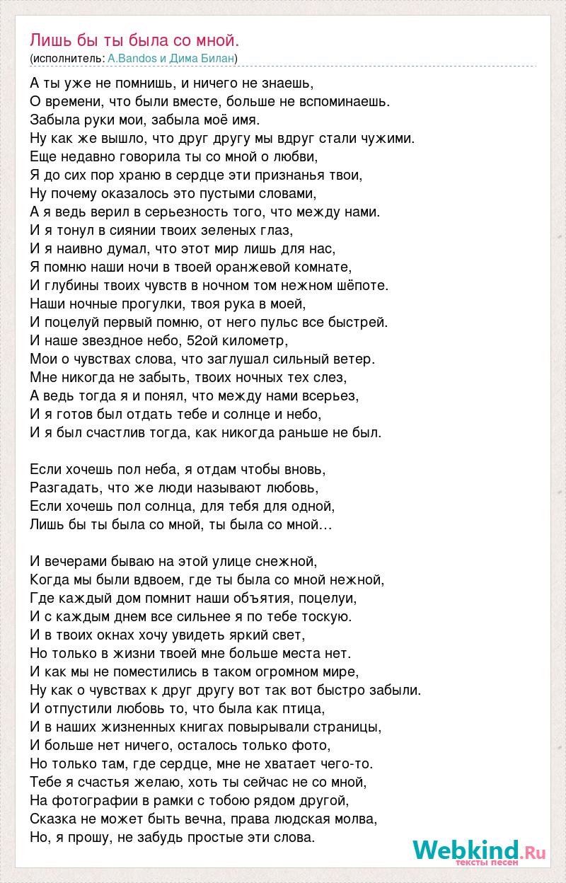 А ты уже не помнишь, и ничего не знаешь, О времени, что были вместе, больше не вспоминаешь. Забыла руки мои, забыла моё имя. Ну как же вышло, что друг другу мы вдруг стали чужими. Еще недавно говорила ты со мной о любви, Я до сих пор храню в сердце эти признанья твои, Ну почему оказалось это пустыми словами, А я ведь верил в серьезность того, что между нами. И я тонул в сиянии твоих зеленых глаз, И я наивно думал, что этот мир лишь для нас, Я помню наши ночи в твоей оранжевой комнате, И глубины твоих чувств в ночном том нежном шёпоте. Наши ночные прогулки, твоя рука в моей, И поцелуй первый помню, от него пульс все быстрей. И наше звездное небо, 52ой километр, Мои о чувствах слова, что заглушал сильный ветер. Мне никогда не забыть, твоих ночных тех слез, А ведь тогда я и понял, что между нами всерьез, И я готов был отдать тебе и солнце и небо, И я был счастлив тогда, как никогда раньше не был. Если хочешь пол неба, я отдам чтобы вновь, Разгадать, что же люди называют любовь, Если хочешь пол солнца, для тебя для одной, Лишь бы ты была со мной, ты была со мной… И вечерами бываю на этой улице снежной, Когда мы были вдвоем, где ты была со мной нежной, Где каждый дом помнит наши объятия, поцелуи, И с каждым днем все сильнее я по тебе тоскую. И в твоих окнах хочу увидеть яркий свет, Но только в жизни твоей мне больше места нет. И как мы не поместились в таком огромном мире, Ну как о чувствах к друг другу вот так вот быстро забыли. И отпустили любовь то, что была как птица, И в наших жизненных книгах повырывали страницы, И больше нет ничего, осталось только фото, Но только там, где сердце, мне не хватает чего-то. Тебе я счастья желаю, хоть ты сейчас не со мной, На фотографии в рамки с тобою рядом другой, Сказка не может быть вечна, права людская молва, Но, я прошу, не забудь простые эти слова.