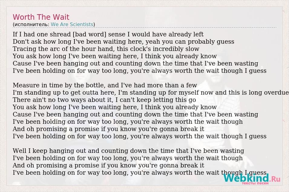 If I had one shread [bad word] sense I would have already left Don't ask how long I've been waiting here, yeah you can probably guess Tracing the arc of the hour hand, this clock's incredibly slow You ask how long I've been waiting here, I think you already know Cause I've been hanging out and counting down the time that I've been wasting I've been holding on for way too long, you're always worth the wait though I guess Measure in time by the bottle, and I've had more than a few I'm standing up to get outta here, I'm standing up for myself now and this is long overdue There ain't no two ways about it, I can't keep letting this go You ask how long I've been waiting here, I think you already know Cause I've been hanging out and counting down the time that I've been wasting I've been holding on for way too long, you're always worth the wait though And oh promising a promise if you know you're gonna break it I've been holding on for way too long, you're always worth the wait though I guess Well I keep hanging out and counting down the time that I've been wasting I've been holding on for way too long, you're always worth the wait though And oh promising a promise if you know you're gonna break it I've been holding on for way too long, you're always worth the wait though I guess