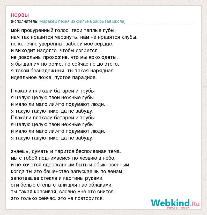 мой прокуренный голос. твои теплые губы. нам так нравится мерзнуть. нам не нравятся клубы. но конечно уверенны. забери мое сердце. и выходит надолго. чтобы согрется. не довольны прохожие. что мы ярко одеты. я бы дал им по роже. но сейчас не до этого. я такой безнадежный. ты такая нарядная. идеальное ложе. пустое парадное. Плакали плакали батареи и трубы я целую целую твои нежные губы и мало ли мало ли.что подумают люди. я такую такую никогда не забуду. Плакали плакали батареи и трубы я целую целую твои нежные губы и мало ли мало ли.что подумают люди. я такую такую никогда не забуду. знаешь, думать и парится бесполезная тема. мы с тобой поднимаемся по лезвию в небо. и не хочется сдержанным быть и обыкновенным. когда ты это бешенство запускаешь по венам. запотевшее стекла и картины руками. эти белые стены стали для нас облаками. ты такая красивая. словно мне это снится. это только сейчас. это не повторится.