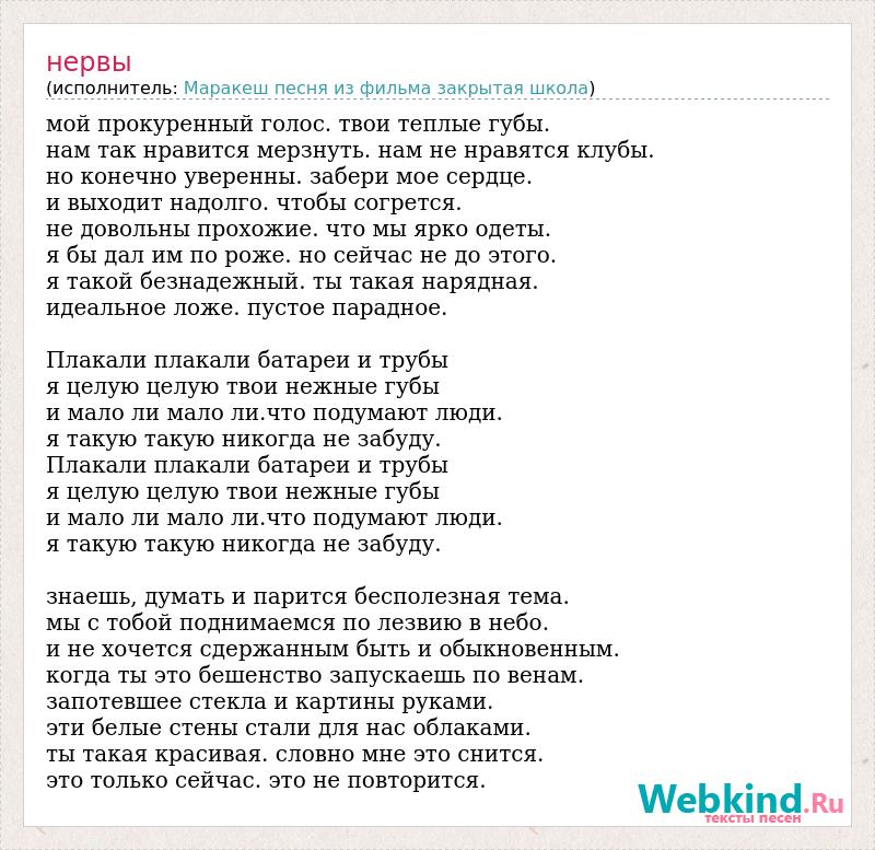 мой прокуренный голос. твои теплые губы. нам так нравится мерзнуть. нам не нравятся клубы. но конечно уверенны. забери мое сердце. и выходит надолго. чтобы согрется. не довольны прохожие. что мы ярко одеты. я бы дал им по роже. но сейчас не до этого. я такой безнадежный. ты такая нарядная. идеальное ложе. пустое парадное. Плакали плакали батареи и трубы я целую целую твои нежные губы и мало ли мало ли.что подумают люди. я такую такую никогда не забуду. Плакали плакали батареи и трубы я целую целую твои нежные губы и мало ли мало ли.что подумают люди. я такую такую никогда не забуду. знаешь, думать и парится бесполезная тема. мы с тобой поднимаемся по лезвию в небо. и не хочется сдержанным быть и обыкновенным. когда ты это бешенство запускаешь по венам. запотевшее стекла и картины руками. эти белые стены стали для нас облаками. ты такая красивая. словно мне это снится. это только сейчас. это не повторится.