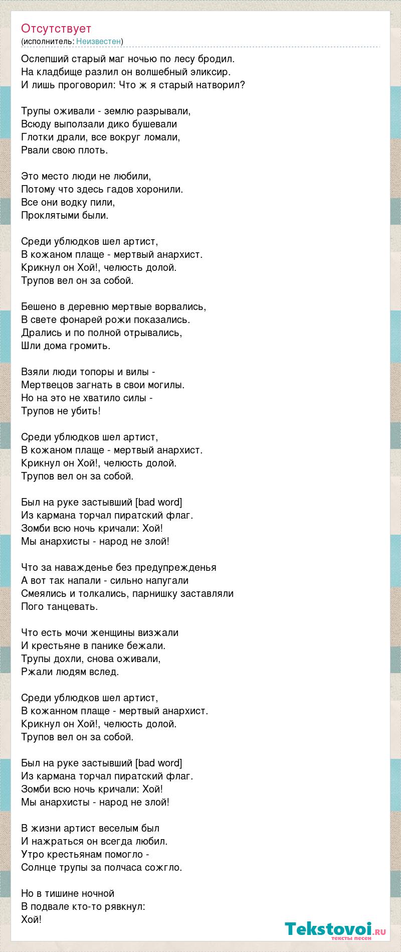 Ослепший старый маг ночью по лесу бродил. На кладбище разлил он волшебный эликсир. И лишь проговорил: Что ж я старый натворил? Трупы оживали - землю разрывали, Всюду выползали дико бушевали Глотки драли, все вокруг ломали, Рвали свою плоть. Это место люди не любили, Потому что здесь гадов хоронили. Все они водку пили, Проклятыми были. Среди ублюдков шел артист, В кожаном плаще - мертвый анархист. Крикнул он Хой!, челюсть долой. Трупов вел он за собой. Бешено в деревню мертвые ворвались, В свете фонарей рожи показались. Дрались и по полной отрывались, Шли дома громить. Взяли люди топоры и вилы - Мертвецов загнать в свои могилы. Но на это не хватило силы - Трупов не убить! Среди ублюдков шел артист, В кожаном плаще - мертвый анархист. Крикнул он Хой!, челюсть долой. Трупов вел он за собой. Был на руке застывший [bad word] Из кармана торчал пиратский флаг. Зомби всю ночь кричали: Хой! Мы анархисты - народ не злой! Что за наважденье без предупрежденья А вот так напали - сильно напугали Смеялись и толкались, парнишку заставляли Пого танцевать. Что есть мочи женщины визжали И крестьяне в панике бежали. Трупы дохли, снова оживали, Ржали людям вслед. Среди ублюдков шел артист, В кожанном плаще - мертвый анархист. Крикнул он Хой!, челюсть долой. Трупов вел он за собой. Был на руке застывший [bad word] Из кармана торчал пиратский флаг. Зомби всю ночь кричали: Хой! Мы анархисты - народ не злой! В жизни артист веселым был И нажраться он всегда любил. Утро крестьянам помогло - Солнце трупы за полчаса сожгло. Но в тишине ночной В подвале кто-то рявкнул: Хой!