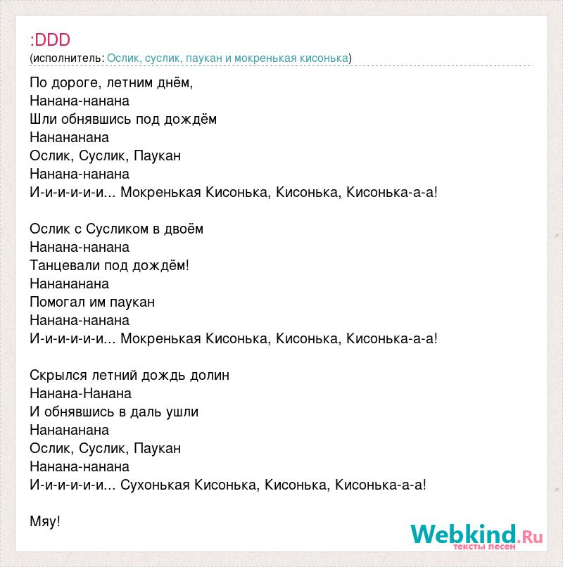 По дороге, летним днём, Нанана-нанана Шли обнявшись под дождём Нанананана Ослик, Суслик, Паукан Нанана-нанана И-и-и-и-и-и... Мокренькая Кисонька, Кисонька, Кисонька-а-а! Ослик с Сусликом в двоём Нанана-нанана Танцевали под дождём! Нанананана Помогал им паукан Нанана-нанана И-и-и-и-и-и... Мокренькая Кисонька, Кисонька, Кисонька-а-а! Скрылся летний дождь долин Нанана-Нанана И обнявшись в даль ушли Нанананана Ослик, Суслик, Паукан Нанана-нанана И-и-и-и-и-и... Сухонькая Кисонька, Кисонька, Кисонька-а-а! Мяу!