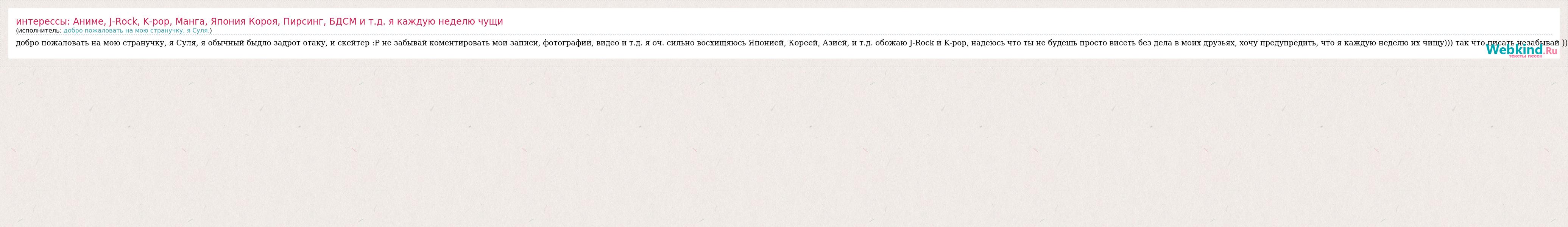 Главная→Исполнители→Добро пожаловать на мою странучку, я Суля.→Интересcы: Аниме, J-Rock, K-pop, Манга, Япония Короя, Пирсинг, БДСМ и