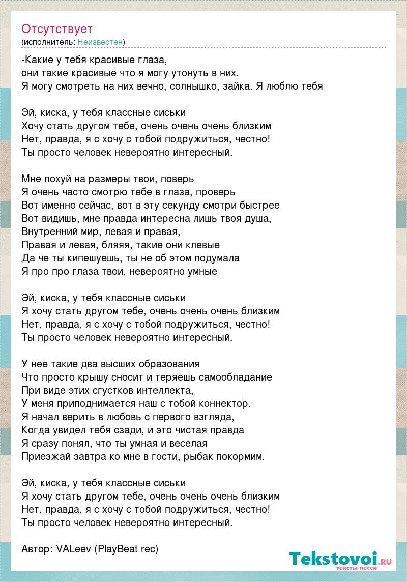 -Какие у тебя красивые глаза, они такие красивые что я могу утонуть в них. Я могу смотреть на них вечно, солнышко, зайка. Я люблю тебя Эй, киска, у тебя классные сиськи Хочу стать другом тебе, очень очень очень близким Нет, правда, я с хочу с тобой подружиться, честно! Ты просто человек невероятно интересный. Мне похуй на размеры твои, поверь Я очень часто смотрю тебе в глаза, проверь Вот именно сейчас, вот в эту секунду смотри быстрее Вот видишь, мне правда интересна лишь твоя душа, Внутренний мир, левая и правая, Правая и левая, бляяя, такие они клевые Да че ты кипешуешь, ты не об этом подумала Я про про глаза твои, невероятно умные Эй, киска, у тебя классные сиськи Я хочу стать другом тебе, очень очень очень близким Нет, правда, я с хочу с тобой подружиться, честно! Ты просто человек невероятно интересный. У нее такие два высших образования Что просто крышу сносит и теряешь самообладание При виде этих сгустков интеллекта, У меня приподнимается наш с тобой коннектор. Я начал верить в любовь с первого взгляда, Когда увидел тебя сзади, и это чистая правда Я сразу понял, что ты умная и веселая Приезжай завтра ко мне в гости, рыбак покормим. Эй, киска, у тебя классные сиськи Я хочу стать другом тебе, очень очень очень близким Нет, правда, я с хочу с тобой подружиться, честно! Ты просто человек невероятно интересный. Автор: VALeev (PlayBeat rec)