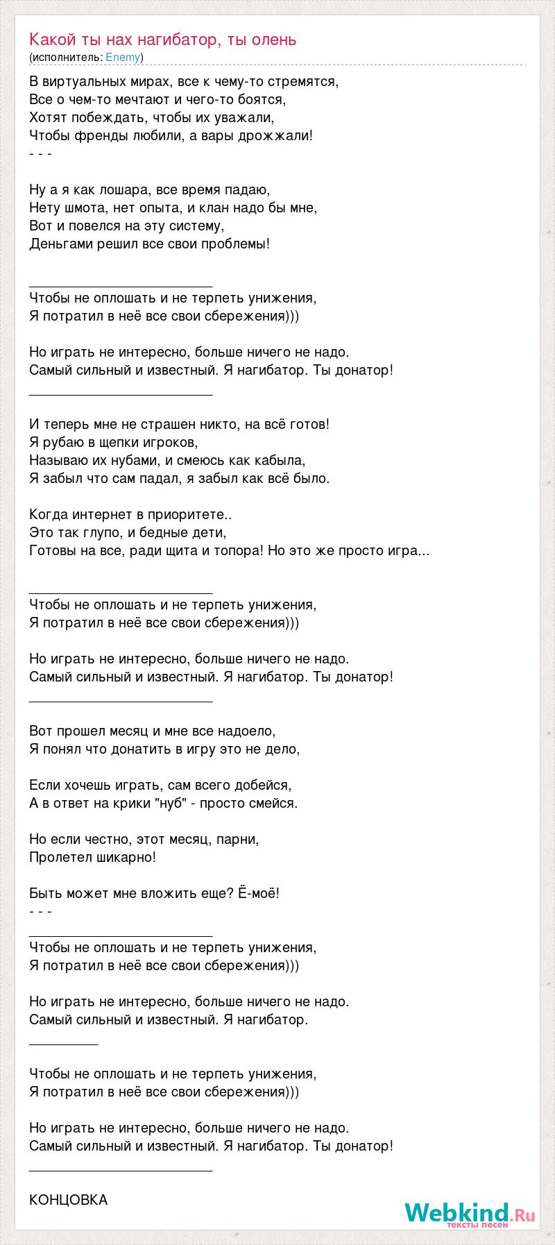 В виртуальных мирах, все к чему-то стремятся, Все о чем-то мечтают и чего-то боятся, Хотят побеждать, чтобы их уважали, Чтобы френды любили, а вары дрожжали! - - - Ну а я как лошара, все время падаю, Нету шмота, нет опыта, и клан надо бы мне, Вот и повелся на эту систему, Деньгами решил все свои проблемы! ________________________ Чтобы не оплошать и не терпеть унижения, Я потратил в неё все свои сбережения))) Но играть не интересно, больше ничего не надо. Самый сильный и известный. Я нагибатор. Ты донатор! ________________________ И теперь мне не страшен никто, на всё готов! Я рубаю в щепки игроков, Называю их нубами, и смеюсь как кабыла, Я забыл что сам падал, я забыл как всё было. Когда интернет в приоритете.. Это так глупо, и бедные дети, Готовы на все, ради щита и топора! Но это же просто игра... ________________________ Чтобы не оплошать и не терпеть унижения, Я потратил в неё все свои сбережения))) Но играть не интересно, больше ничего не надо. Самый сильный и известный. Я нагибатор. Ты донатор! ________________________ Вот прошел месяц и мне все надоело, Я понял что донатить в игру это не дело, Если хочешь играть, сам всего добейся, А в ответ на крики "нуб" - просто смейся. Но если честно, этот месяц, парни, Пролетел шикарно! Быть может мне вложить еще? Ё-моё! - - - ________________________ Чтобы не оплошать и не терпеть унижения, Я потратил в неё все свои сбережения))) Но играть не интересно, больше ничего не надо. Самый сильный и известный. Я нагибатор. _________ Чтобы не оплошать и не терпеть унижения, Я потратил в неё все свои сбережения))) Но играть не интересно, больше ничего не надо. Самый сильный и известный. Я нагибатор. Ты донатор! ________________________ КОНЦОВКА
