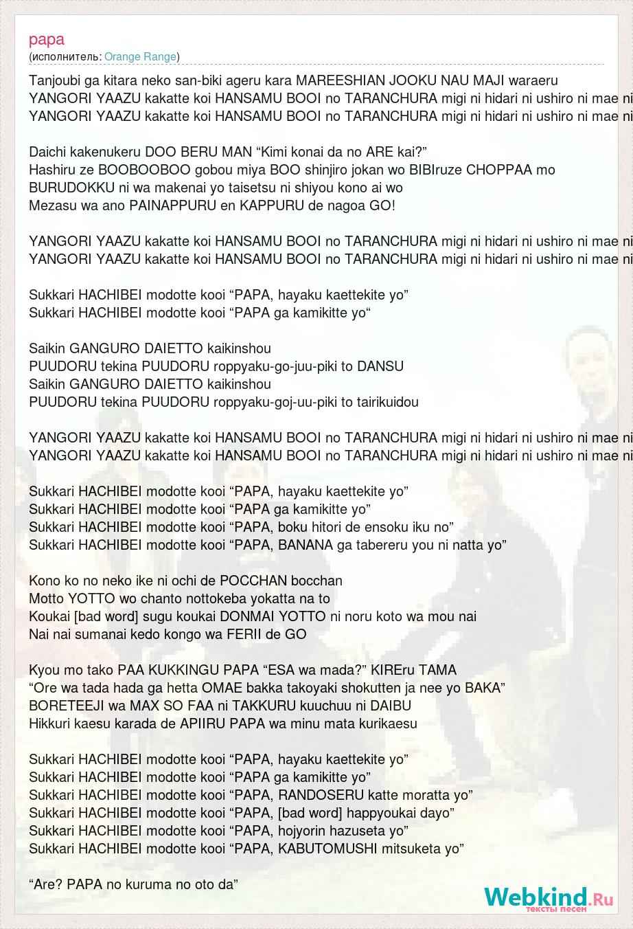 Tanjoubi ga kitara neko san-biki ageru kara MAREESHIAN JOOKU NAU MAJI waraeru YANGORI YAAZU kakatte koi HANSAMU BOOI no TARANCHURA migi ni hidari ni ushiro ni mae ni YANGORI YAAZU kakatte koi HANSAMU BOOI no TARANCHURA migi ni hidari ni ushiro ni mae ni Daichi kakenukeru DOO BERU MAN “Kimi konai da no ARE kai?” Hashiru ze BOOBOOBOO gobou miya BOO shinjiro jokan wo BIBIruze CHOPPAA mo BURUDOKKU ni wa makenai yo taisetsu ni shiyou kono ai wo Mezasu wa ano PAINAPPURU en KAPPURU de nagoa GO! YANGORI YAAZU kakatte koi HANSAMU BOOI no TARANCHURA migi ni hidari ni ushiro ni mae ni YANGORI YAAZU kakatte koi HANSAMU BOOI no TARANCHURA migi ni hidari ni ushiro ni mae ni Sukkari HACHIBEI modotte kooi “PAPA, hayaku kaettekite yo” Sukkari HACHIBEI modotte kooi “PAPA ga kamikitte yo“ Saikin GANGURO DAIETTO kaikinshou PUUDORU tekina PUUDORU roppyaku-go-juu-piki to DANSU Saikin GANGURO DAIETTO kaikinshou PUUDORU tekina PUUDORU roppyaku-goj-uu-piki to tairikuidou YANGORI YAAZU kakatte koi HANSAMU BOOI no TARANCHURA migi ni hidari ni ushiro ni mae ni YANGORI YAAZU kakatte koi HANSAMU BOOI no TARANCHURA migi ni hidari ni ushiro ni mae ni Sukkari HACHIBEI modotte kooi “PAPA, hayaku kaettekite yo” Sukkari HACHIBEI modotte kooi “PAPA ga kamikitte yo” Sukkari HACHIBEI modotte kooi “PAPA, boku hitori de ensoku iku no” Sukkari HACHIBEI modotte kooi “PAPA, BANANA ga tabereru you ni natta yo” Kono ko no neko ike ni ochi de POCCHAN bocchan Motto YOTTO wo chanto nottokeba yokatta na to Koukai [bad word] sugu koukai DONMAI YOTTO ni noru koto wa mou nai Nai nai sumanai kedo kongo wa FERII de GO Kyou mo tako PAA KUKKINGU PAPA “ESA wa mada?” KIREru TAMA “Ore wa tada hada ga hetta OMAE bakka takoyaki shokutten ja nee yo BAKA” BORETEEJI wa MAX SO FAA ni TAKKURU kuuchuu ni DAIBU Hikkuri kaesu karada de APIIRU PAPA wa minu mata kurikaesu Sukkari HACHIBEI modotte kooi “PAPA, hayaku kaettekite yo” Sukkari HACHIBEI modotte kooi “PAPA ga kamikitte yo” Sukkari HACHIBEI modotte kooi “PAPA, RANDOSERU katte moratta yo” Sukkari HACHIBEI modotte kooi “PAPA, [bad word] happyoukai dayo” Sukkari HACHIBEI modotte kooi “PAPA, hojyorin hazuseta yo” Sukkari HACHIBEI modotte kooi “PAPA, KABUTOMUSHI mitsuketa yo” “Are? PAPA no kuruma no oto da”