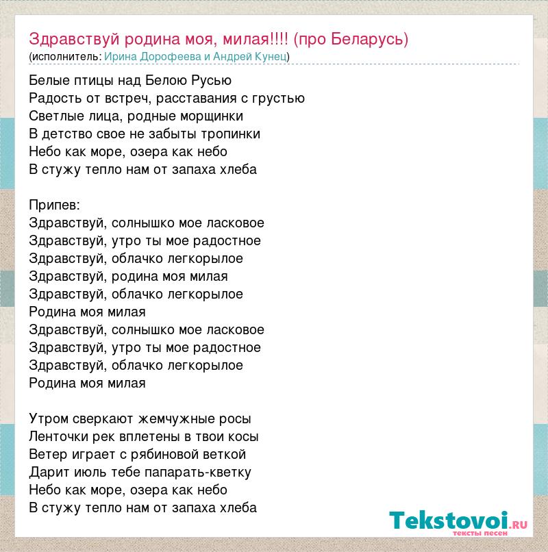 Белые птицы над Белою Русью Радость от встреч, расставания с грустью Светлые лица, родные морщинки В детство свое не забыты тропинки Небо как море, озера как небо В стужу тепло нам от запаха хлеба Припев: Здравствуй, солнышко мое ласковое Здравствуй, утро ты мое радостное Здравствуй, облачко легкорылое Здравствуй, родина моя милая Здравствуй, облачко легкорылое Родина моя милая Здравствуй, солнышко мое ласковое Здравствуй, утро ты мое радостное Здравствуй, облачко легкорылое Родина моя милая Утром сверкают жемчужные росы Ленточки рек вплетены в твои косы Ветер играет с рябиновой веткой Дарит июль тебе папарать-кветку Небо как море, озера как небо В стужу тепло нам от запаха хлеба