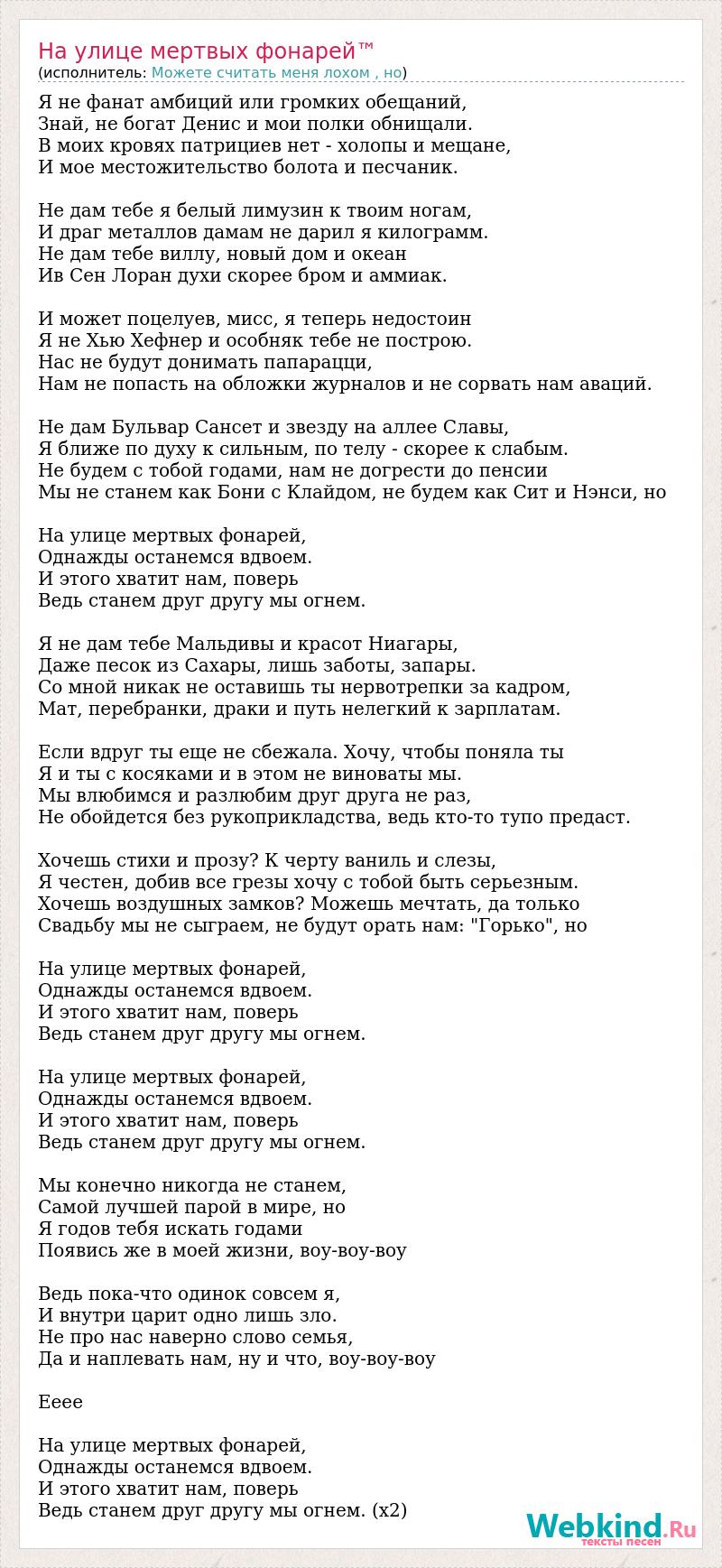 Я не фанат амбиций или громких обещаний, Знай, не богат Денис и мои полки обнищали. В моих кровях патрициев нет - холопы и мещане, И мое местожительство болота и песчаник. Не дам тебе я белый лимузин к твоим ногам, И драг металлов дамам не дарил я килограмм. Не дам тебе виллу, новый дом и океан Ив Сен Лоран духи скорее бром и аммиак. И может поцелуев, мисс, я теперь недостоин Я не Хью Хефнер и особняк тебе не построю. Нас не будут донимать папарацци, Нам не попасть на обложки журналов и не сорвать нам аваций. Не дам Бульвар Сансет и звезду на аллее Славы, Я ближе по духу к сильным, по телу - скорее к слабым. Не будем с тобой годами, нам не догрести до пенсии Мы не станем как Бони с Клайдом, не будем как Сит и Нэнси, но На улице мертвых фонарей, Однажды останемся вдвоем. И этого хватит нам, поверь Ведь станем друг другу мы огнем. Я не дам тебе Мальдивы и красот Ниагары, Даже песок из Сахары, лишь заботы, запары. Со мной никак не оставишь ты нервотрепки за кадром, Мат, перебранки, драки и путь нелегкий к зарплатам. Если вдруг ты еще не сбежала. Хочу, чтобы поняла ты Я и ты с косяками и в этом не виноваты мы. Мы влюбимся и разлюбим друг друга не раз, Не обойдется без рукоприкладства, ведь кто-то тупо предаст. Хочешь стихи и прозу? К черту ваниль и слезы, Я честен, добив все грезы хочу с тобой быть серьезным. Хочешь воздушных замков? Можешь мечтать, да только Свадьбу мы не сыграем, не будут орать нам: "Горько", но На улице мертвых фонарей, Однажды останемся вдвоем. И этого хватит нам, поверь Ведь станем друг другу мы огнем. На улице мертвых фонарей, Однажды останемся вдвоем. И этого хватит нам, поверь Ведь станем друг другу мы огнем. Мы конечно никогда не станем, Самой лучшей парой в мире, но Я годов тебя искать годами Появись же в моей жизни, воу-воу-воу Ведь пока-что одинок совсем я, И внутри царит одно лишь зло. Не про нас наверно слово семья, Да и наплевать нам, ну и что, воу-воу-воу Ееее На улице мертвых фонарей, Однажды останемся вдвоем. И этого хватит нам, поверь Ведь станем друг другу мы огнем. (x2)