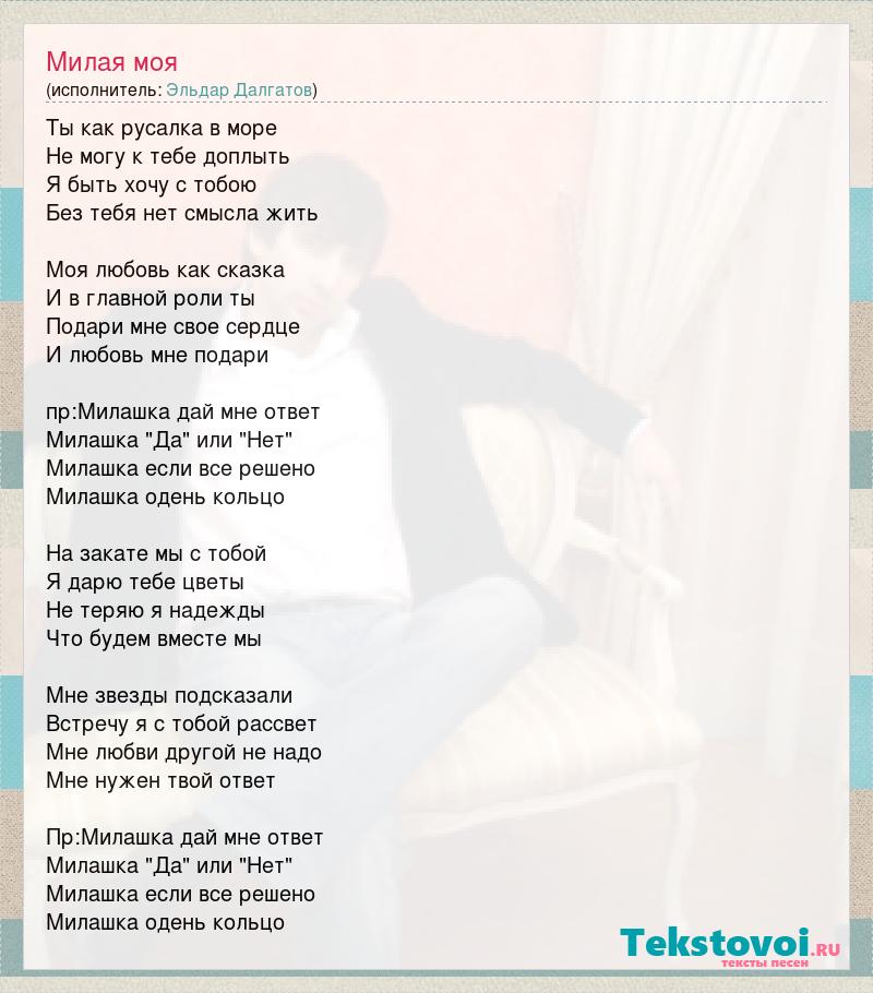 Ты как русалка в море Не могу к тебе доплыть Я быть хочу с тобою Без тебя нет смысла жить Моя любовь как сказка И в главной роли ты Подари мне свое сердце И любовь мне подари пр:Милашка дай мне ответ Милашка "Да" или "Нет" Милашка если все решено Милашка одень кольцо На закате мы с тобой Я дарю тебе цветы Не теряю я надежды Что будем вместе мы Мне звезды подсказали Встречу я с тобой рассвет Мне любви другой не надо Мне нужен твой ответ Пр:Милашка дай мне ответ Милашка "Да" или "Нет" Милашка если все решено Милашка одень кольцо