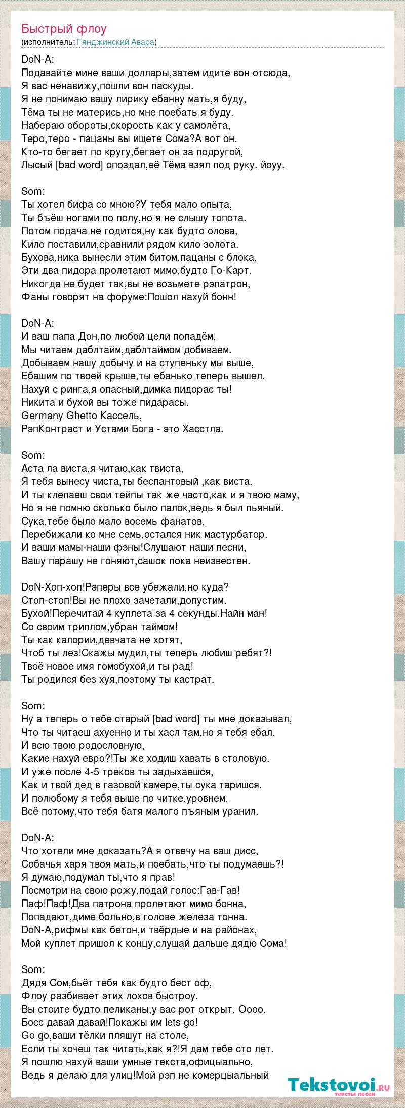 DoN-A: Подавайте мине ваши доллары,затем идите вон отсюда, Я вас ненавижу,пошли вон паскуды. Я не понимаю вашу лирику ебанну мать,я буду, Тёма ты не матерись,но мне поебать я буду. Набераю обороты,скорость как у самолёта, Теро,теро - пацаны вы ищете Сома?А вот он. Кто-то бегает по кругу,бегает он за подругой, Лысый [bad word] опоздал,её Тёма взял под руку. йоуу. Som: Ты хотел бифа со мною?У тебя мало опыта, Ты бъёш ногами по полу,но я не слышу топота. Потом подача не годится,ну как будто олова, Кило поставили,сравнили рядом кило золота. Бухова,ника вынесли этим битом,пацаны с блока, Эти два пидора пролетают мимо,будто Го-Карт. Никогда не будет так,вы не возьмете рэпатрон, Фаны говорят на форуме:Пошол нахуй бонн! DoN-A: И ваш папа Дон,по любой цели попадём, Мы читаем даблтайм,даблтаймом добиваем. Добываем нашу добычу и на ступеньку мы выше, Ебашим по твоей крыше,ты ебанько теперь вышел. Нахуй с ринга,я опасный,димка пидорас ты! Никита и бухой вы тоже пидарасы. Germany Ghetto Кассель, РэпКонтраст и Устами Бога - это Хасстла. Som: Аста ла виста,я читаю,как твиста, Я тебя вынесу чиста,ты беспантовый ,как виста. И ты клепаеш свои тейпы так же часто,как и я твою маму, Но я не помню сколько было палок,ведь я был пьяный. Сука,тебе было мало восемь фанатов, Перебижали ко мне семь,остался ник мастурбатор. И ваши мамы-наши фэны!Слушают наши песни, Вашу парашу не гоняют,сашок пока неизвестен. DoN-Хоп-хоп!Рэперы все убежали,но куда? Стоп-стоп!Вы не плохо зачетали,допустим. Бухой!Перечитай 4 куплета за 4 секунды.Найн ман! Со своим триплом,убран таймом! Ты как калории,девчата не хотят, Чтоб ты лез!Скажы мудил,ты теперь любиш ребят?! Твоё новое имя гомобухой,и ты рад! Ты родился без хуя,поэтому ты кастрат. Som: Ну а теперь о тебе старый [bad word] ты мне доказывал, Что ты читаеш ахуенно и ты хасл там,но я тебя ебал. И всю твою родословную, Какие нахуй евро?!Ты же ходиш хавать в столовую. И уже после 4-5 треков ты задыхаешся, Как и твой дед в газовой камере,ты сука таришся. И полюбому я тебя выше по читке,уровнем, Всё потому,что тебя батя малого пъяным уранил. DoN-A: Что хотели мне доказать?А я отвечу на ваш дисс, Собачья харя твоя мать,и поебать,что ты подумаешь?! Я думаю,подумал ты,что я прав! Посмотри на свою рожу,подай голос:Гав-Гав! Паф!Паф!Два патрона пролетают мимо бонна, Попадают,диме больно,в голове железа тонна. DoN-A,рифмы как бетон,и твёрдые и на районах, Мой куплет пришол к концу,слушай дальше дядю Сома! Som: Дядя Сом,бьёт тебя как будто бест оф, Флоу разбивает этих лохов быстроу. Вы стоите будто пеликаны,у вас рот открыт, Оооо. Босс давай давай!Покажы им lets go! Go go,ваши тёлки пляшут на столе, Если ты хочеш так читать,как я?!Я дам тебе сто лет. Я пошлю нахуй ваши умные текста,офицыально, Ведь я делаю для улиц!Мой рэп не комерцыальный