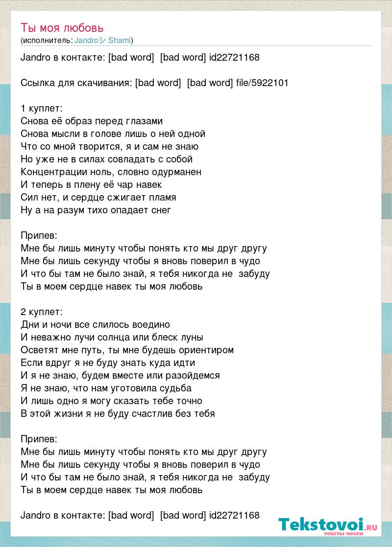 Jandro в контакте: [bad word] [bad word] id22721168 Ссылка для скачивания: [bad word] [bad word] file/5922101 1 куплет: Снова её образ перед глазами Снова мысли в голове лишь о ней одной Что со мной творится, я и сам не знаю Но уже не в силах совладать с собой Концентрации ноль, словно одурманен И теперь в плену её чар навек Сил нет, и сердце сжигает пламя Ну а на разум тихо опадает снег Припев: Мне бы лишь минуту чтобы понять кто мы друг другу Мне бы лишь секунду чтобы я вновь поверил в чудо И что бы там не было знай, я тебя никогда не забуду Ты в моем сердце навек ты моя любовь 2 куплет: Дни и ночи все слилось воедино И неважно лучи солнца или блеск луны Осветят мне путь, ты мне будешь ориентиром Если вдруг я не буду знать куда идти И я не знаю, будем вместе или разойдемся Я не знаю, что нам уготовила судьба И лишь одно я могу сказать тебе точно В этой жизни я не буду счастлив без тебя Припев: Мне бы лишь минуту чтобы понять кто мы друг другу Мне бы лишь секунду чтобы я вновь поверил в чудо И что бы там не было знай, я тебя никогда не забуду Ты в моем сердце навек ты моя любовь Jandro в контакте: [bad word] [bad word] id22721168