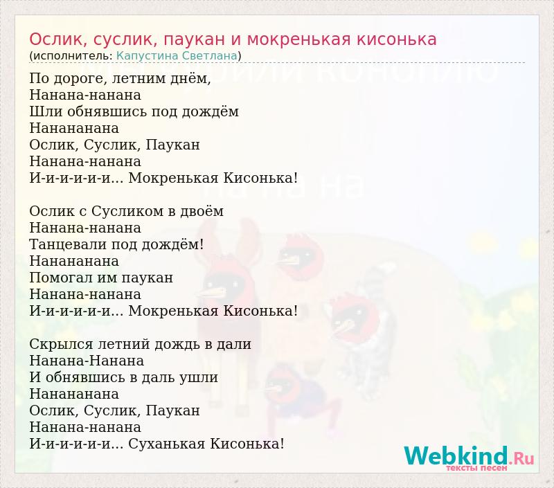 По дороге, летним днём, Нанана-нанана Шли обнявшись под дождём Нанананана Ослик, Суслик, Паукан Нанана-нанана И-и-и-и-и-и... Мокренькая Кисонька! Ослик с Сусликом в двоём Нанана-нанана Танцевали под дождём! Нанананана Помогал им паукан Нанана-нанана И-и-и-и-и-и... Мокренькая Кисонька! Скрылся летний дождь в дали Нанана-Нанана И обнявшись в даль ушли Нанананана Ослик, Суслик, Паукан Нанана-нанана И-и-и-и-и-и... Суханькая Кисонька!