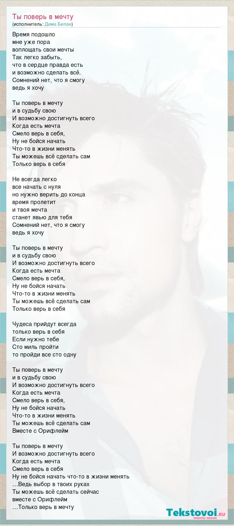 Время подошло мне уже пора воплощать свои мечты Так легко забыть, что в сердце правда есть и возможно сделать всё. Сомнений нет, что я смогу ведь я хочу Ты поверь в мечту и в судьбу свою И возможно достигнуть всего Когда есть мечта Смело верь в себя, Ну не бойся начать Что-то в жизни менять Ты можешь всё сделать сам Только верь в себя Не всегда легко все начать с нуля но нужно верить до конца время пролетит и твоя мечта станет явью для тебя Сомнений нет, что я смогу ведь я хочу Ты поверь в мечту и в судьбу свою И возможно достигнуть всего Когда есть мечта Смело верь в себя, Ну не бойся начать Что-то в жизни менять Ты можешь всё сделать сам Только верь в себя Чудеса прийдут всегда только верь в себя Если нужно тебе Сто миль пройти то пройди все сто одну Ты поверь в мечту и в судьбу свою И возможно достигнуть всего Когда есть мечта Смело верь в себя, Ну не бойся начать Что-то в жизни менять Ты можешь всё сделать сам Вместе с Орифлейм Ты поверь в мечту И возможно достигнуть всего Когда есть мечта Смело верь в себя Ну не бойся начать что-то в жизни менять …Ведь выбор в твоих руках Ты можешь всё сделать сейчас вместе с Орифлейм …Только верь в мечту