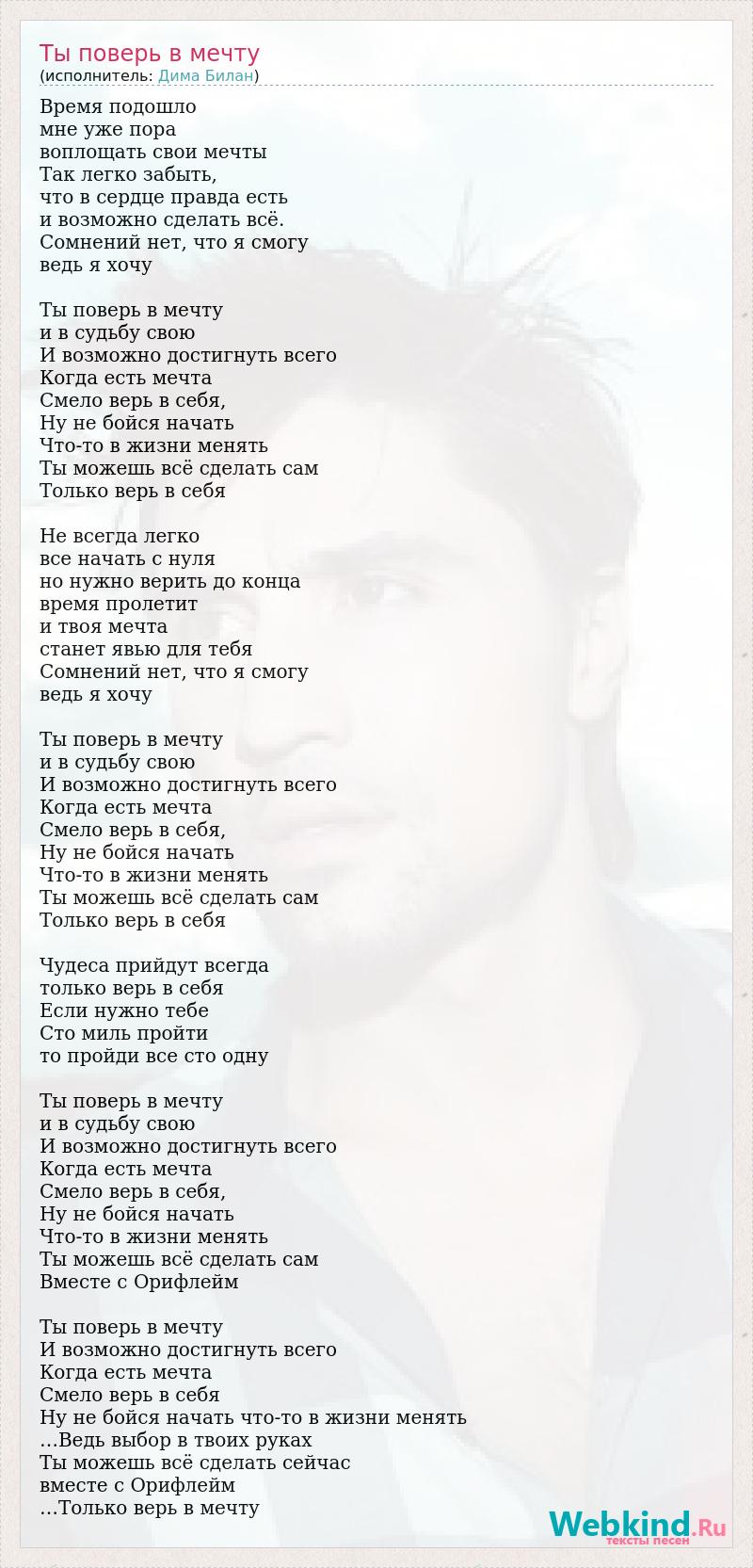 Время подошло мне уже пора воплощать свои мечты Так легко забыть, что в сердце правда есть и возможно сделать всё. Сомнений нет, что я смогу ведь я хочу Ты поверь в мечту и в судьбу свою И возможно достигнуть всего Когда есть мечта Смело верь в себя, Ну не бойся начать Что-то в жизни менять Ты можешь всё сделать сам Только верь в себя Не всегда легко все начать с нуля но нужно верить до конца время пролетит и твоя мечта станет явью для тебя Сомнений нет, что я смогу ведь я хочу Ты поверь в мечту и в судьбу свою И возможно достигнуть всего Когда есть мечта Смело верь в себя, Ну не бойся начать Что-то в жизни менять Ты можешь всё сделать сам Только верь в себя Чудеса прийдут всегда только верь в себя Если нужно тебе Сто миль пройти то пройди все сто одну Ты поверь в мечту и в судьбу свою И возможно достигнуть всего Когда есть мечта Смело верь в себя, Ну не бойся начать Что-то в жизни менять Ты можешь всё сделать сам Вместе с Орифлейм Ты поверь в мечту И возможно достигнуть всего Когда есть мечта Смело верь в себя Ну не бойся начать что-то в жизни менять …Ведь выбор в твоих руках Ты можешь всё сделать сейчас вместе с Орифлейм …Только верь в мечту