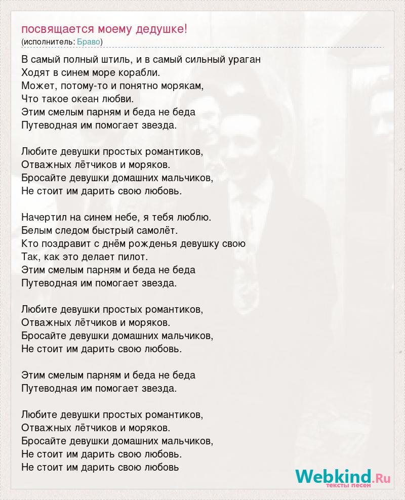 В самый полный штиль, и в самый сильный ураган Ходят в синем море корабли. Может, потому-то и понятно морякам, Что такое океан любви. Этим смелым парням и беда не беда Путеводная им помогает звезда. Любите девушки простых романтиков, Отважных лётчиков и моряков. Бросайте девушки домашних мальчиков, Не стоит им дарить свою любовь. Начертил на синем небе, я тебя люблю. Белым следом быстрый самолёт. Кто поздравит с днём рожденья девушку свою Так, как это делает пилот. Этим смелым парням и беда не беда Путеводная им помогает звезда. Любите девушки простых романтиков, Отважных лётчиков и моряков. Бросайте девушки домашних мальчиков, Не стоит им дарить свою любовь. Этим смелым парням и беда не беда Путеводная им помогает звезда. Любите девушки простых романтиков, Отважных лётчиков и моряков. Бросайте девушки домашних мальчиков, Не стоит им дарить свою любовь. Не стоит им дарить свою любовь