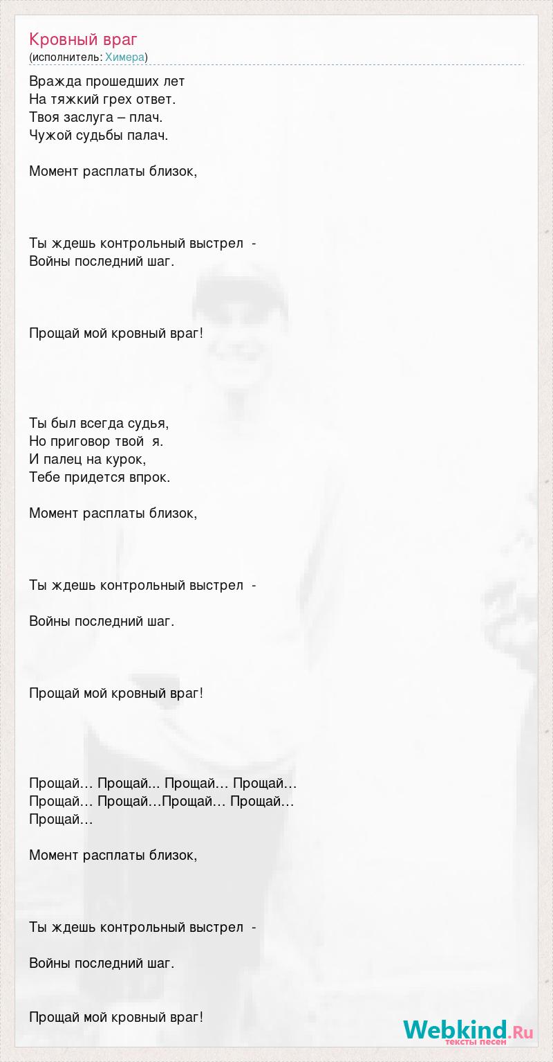 Вражда прошедших лет На тяжкий грех ответ. Твоя заслуга – плач. Чужой судьбы палач. Момент расплаты близок, Ты ждешь контрольный выстрел - Войны последний шаг. Прощай мой кровный враг! Ты был всегда судья, Но приговор твой я. И палец на курок, Тебе придется впрок. Момент расплаты близок, Ты ждешь контрольный выстрел - Войны последний шаг. Прощай мой кровный враг! Прощай… Прощай... Прощай… Прощай… Прощай… Прощай…Прощай… Прощай… Прощай… Момент расплаты близок, Ты ждешь контрольный выстрел - Войны последний шаг. Прощай мой кровный враг!