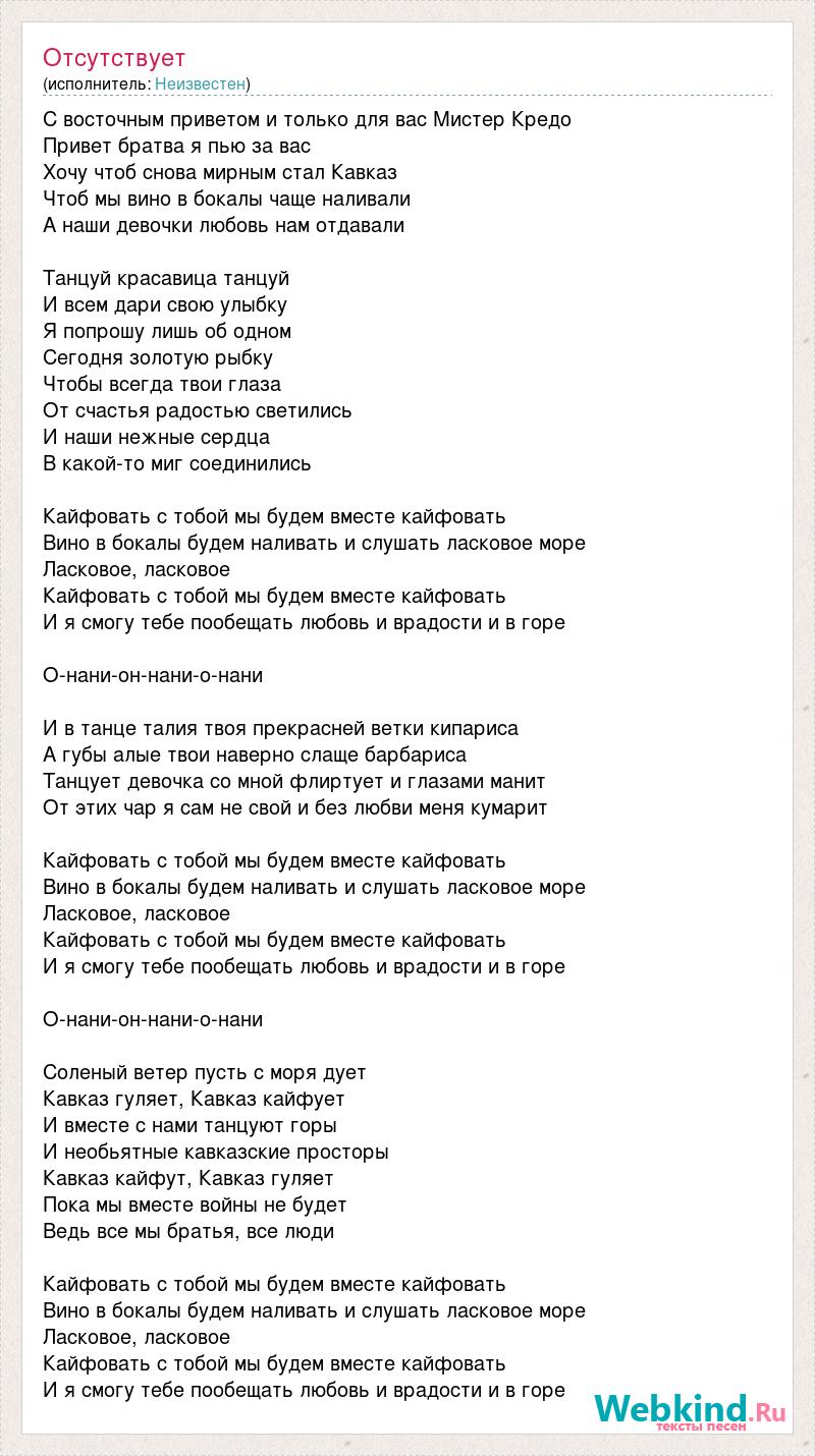 С восточным приветом и только для вас Мистер Кредо Привет братва я пью за вас Хочу чтоб снова мирным стал Кавказ Чтоб мы вино в бокалы чаще наливали А наши девочки любовь нам отдавали Танцуй красавица танцуй И всем дари свою улыбку Я попрошу лишь об одном Сегодня золотую рыбку Чтобы всегда твои глаза От счастья радостью светились И наши нежные сердца В какой-то миг соединились Кайфовать с тобой мы будем вместе кайфовать Вино в бокалы будем наливать и слушать ласковое море Ласковое, ласковое Кайфовать с тобой мы будем вместе кайфовать И я смогу тебе пообещать любовь и врадости и в горе О-нани-он-нани-о-нани И в танце талия твоя прекрасней ветки кипариса А губы алые твои наверно слаще барбариса Танцует девочка со мной флиртует и глазами манит От этих чар я сам не свой и без любви меня кумарит Кайфовать с тобой мы будем вместе кайфовать Вино в бокалы будем наливать и слушать ласковое море Ласковое, ласковое Кайфовать с тобой мы будем вместе кайфовать И я смогу тебе пообещать любовь и врадости и в горе О-нани-он-нани-о-нани Соленый ветер пусть с моря дует Кавказ гуляет, Кавказ кайфует И вместе с нами танцуют горы И необьятные кавказские просторы Кавказ кайфут, Кавказ гуляет Пока мы вместе войны не будет Ведь все мы братья, все люди Кайфовать с тобой мы будем вместе кайфовать Вино в бокалы будем наливать и слушать ласковое море Ласковое, ласковое Кайфовать с тобой мы будем вместе кайфовать И я смогу тебе пообещать любовь и врадости и в горе