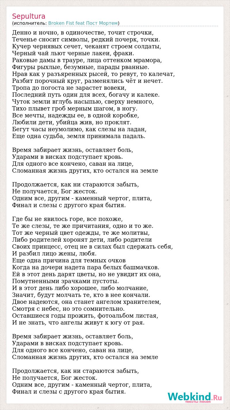 Денно и ночно, в одиночестве, точит строчки, Теченье сносит символы, редкий почерк, точки. Кучер чернявых сечет, чеканят строем солдаты, Черный чай льют черные лакеи, фраки. Раковые дамы в трауре, лица оттенком мрамора, Фигуры рыхлые, безумные, парады рванные. Нрав как у разъяренных рысей, то ревут, то калечат, Разбит порочный круг, разменялись чёт и нечет. Тропа до погоста не зарастет вовеки, Последний путь один для всех, богачу и калеке. Чуток земли вглубь насыпью, сверху немного, Тихо плывет гроб мерным шагом, в ногу. Все мечты, надежды ее, в одной коробке, Любили дети, убийца жив, но проклят. Бегут часы неумолимо, как слезы на ладан, Еще одна судьба, земля принимала падаль. Время забирает жизнь, оставляет боль, Ударами в висках подступает кровь. Для одного все кончено, саван на лице, Сломанная жизнь других, кто остался на земле Продолжается, как ни стараются забыть, Не получается, Бог жесток. Одним все, другим - каменный чертог, плита, Финал и слезы с другого края бытия. Где бы не явилось горе, все похоже, Те же слезы, те же причитания, одно и то же. Тот же черный цвет одежды, те же молитвы, Либо родителей хоронят дети, либо родители Своих принцесс, отец не в силах был сдержать себя, И разбил лицо жены, любя. Еще одна причина для темных очков Когда на дочери надета пара белых башмачков. Ей в этот день дарят цветы, но не увидит их она, Помутненными зрачками пустоты. И в этот день либо хорошее, либо молчание, Значит, будут молчать те, кто в нее кончали. Двое надеются, она станет ангелом хранителем, Смотря с небес, но это сомнительно. Оставшиеся годы прожить, фотоальбом листая, И не знать, что ангелы живут к югу от рая. Время забирает жизнь, оставляет боль, Ударами в висках подступает кровь. Для одного все кончено, саван на лице, Сломанная жизнь других, кто остался на земле Продолжается, как ни стараются забыть, Не получается, Бог жесток. Одним все, другим - каменный чертог, плита, Финал и слезы с другого края бытия.