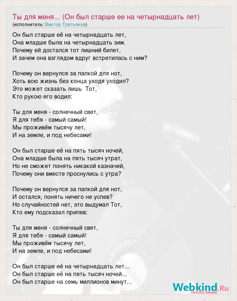 Он был старше её на четырнадцать лет, Она младше была на четырнадцать зим. Почему ей достался тот лишний билет, И зачем она взглядом вдруг встретилась с ним? Почему он вернулся за папкой для нот, Хоть всю жизнь без конца уходя уходил? Это может сказать лишь Тот, Кто рукою его водил: Ты для меня - солнечный свет, Я для тебя - самый самый! Мы проживём тысячу лет, И на земле, и под небесами! Он был старше её на пять тысяч ночей, Она младше была на пять тысяч утрат, Но не сможет понять никакой казначей, Почему они вместе проснулись с утра? Почему он вернулся за папкой для нот, И остался, понять ничего не успев? Но случайностей нет, это выдумал Тот, Кто ему подсказал припев: Ты для меня - солнечный свет, Я для тебя - самый самый! Мы проживём тысячу лет, И на земле, и под небесами! Он был старше её на четырнадцать лет... Он был старше её на пять тысяч ночей... Он был старше на семь миллионов минут...