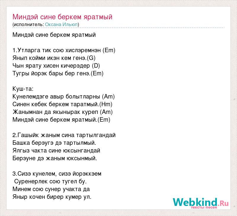 Миндэй сине беркем яратмый 1.Утларга тик сою хислэремнэн (Em) Янып койми икэн кем генэ.(G) Чын ярату хисен кичерэдер (D) Тугры йорэк бары бер генэ.(Em) Куш-та: Кунелемдэге авыр болытларны (Am) Синен кебек беркем таратмый.(Hm) Жанымнан да якынырак куреп (Am) Миндэй сине беркем яратмый.(Em) 2.Гашыйк жаным сина тартылгандай Башка берэугэ дэ тартылмый. Ялгыз чакта сине юксынгандай Берэуне дэ жаным юксынмый. 3.Сизэ кунелем, сизэ йорэккэем Суренерлек сою тугел бу. Минем сою сунер учакта да Яныр кочен бирер кумер ул.