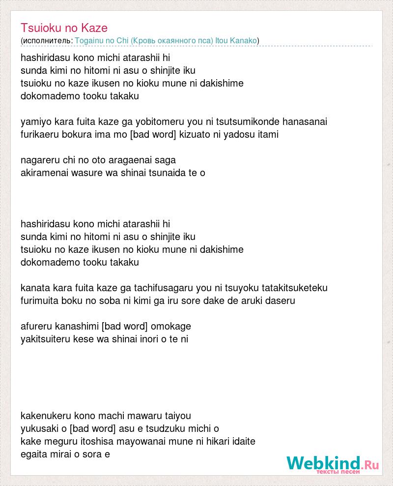 hashiridasu kono michi atarashii hi sunda kimi no hitomi ni asu o shinjite iku tsuioku no kaze ikusen no kioku mune ni dakishime dokomademo tooku takaku yamiyo kara fuita kaze ga yobitomeru you ni tsutsumikonde hanasanai furikaeru bokura ima mo [bad word] kizuato ni yadosu itami nagareru chi no oto aragaenai saga akiramenai wasure wa shinai tsunaida te o hashiridasu kono michi atarashii hi sunda kimi no hitomi ni asu o shinjite iku tsuioku no kaze ikusen no kioku mune ni dakishime dokomademo tooku takaku kanata kara fuita kaze ga tachifusagaru you ni tsuyoku tatakitsuketeku furimuita boku no soba ni kimi ga iru sore dake de aruki daseru afureru kanashimi [bad word] omokage yakitsuiteru kese wa shinai inori o te ni kakenukeru kono machi mawaru taiyou yukusaki o [bad word] asu e tsudzuku michi o kake meguru itoshisa mayowanai mune ni hikari idaite egaita mirai o sora e