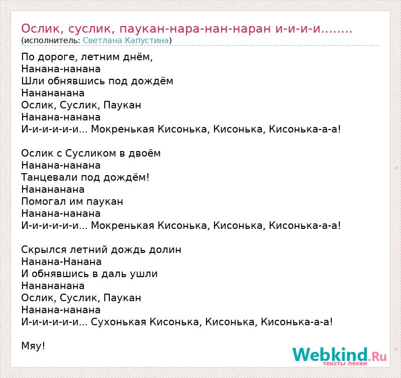 По дороге, летним днём, Нанана-нанана Шли обнявшись под дождём Нанананана Ослик, Суслик, Паукан Нанана-нанана И-и-и-и-и-и... Мокренькая Кисонька, Кисонька, Кисонька-а-а! Ослик с Сусликом в двоём Нанана-нанана Танцевали под дождём! Нанананана Помогал им паукан Нанана-нанана И-и-и-и-и-и... Мокренькая Кисонька, Кисонька, Кисонька-а-а! Скрылся летний дождь долин Нанана-Нанана И обнявшись в даль ушли Нанананана Ослик, Суслик, Паукан Нанана-нанана И-и-и-и-и-и... Сухонькая Кисонька, Кисонька, Кисонька-а-а! Мяу!