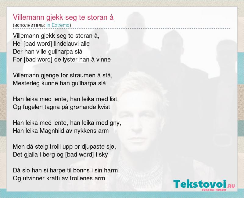 Villemann gjekk seg te storan å, Hei [bad word] lindelauvi alle Der han ville gullharpa slå For de runerne de lyster han å vinne Villemann gjenge for straumen å stå, Mesterleg kunne han gullharpa slå Han leika med lente, han leika med list, Og fugelen tagna på grønande kvist Han leika med lente, han leika med gny, Han leika Magnhild av nykkens arm Men då steig trolli upp or djupaste sjø, Det gjalla i berg og det runga i sky Då slo han si harpe til bonns i sin harm, Og utvinner krafti av trollenes arm