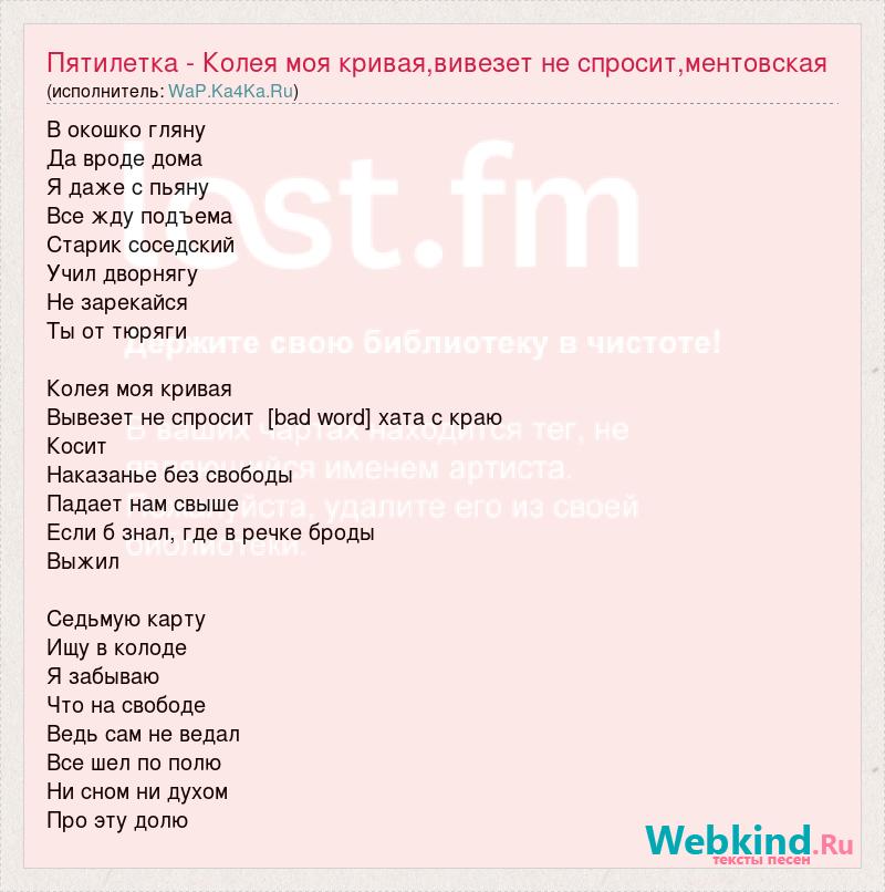 В окошко гляну Да вроде дома Я даже с пьяну Все жду подъема Старик соседский Учил дворнягу Не зарекайся Ты от тюряги Колея моя кривая Вывезет не спросит [bad word] хата с краю Косит Наказанье без свободы Падает нам свыше Если б знал, где в речке броды Выжил Седьмую карту Ищу в колоде Я забываю Что на свободе Ведь сам не ведал Все шел по полю Ни сном ни духом Про эту долю