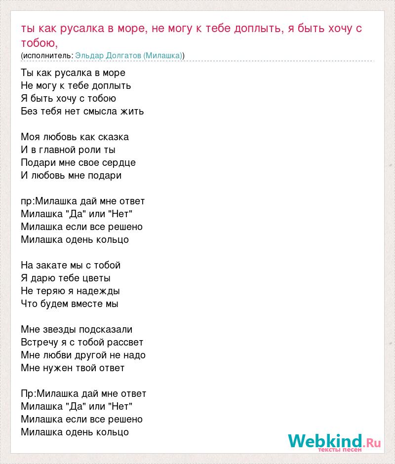 Ты как русалка в море Не могу к тебе доплыть Я быть хочу с тобою Без тебя нет смысла жить Моя любовь как сказка И в главной роли ты Подари мне свое сердце И любовь мне подари пр:Милашка дай мне ответ Милашка "Да" или "Нет" Милашка если все решено Милашка одень кольцо На закате мы с тобой Я дарю тебе цветы Не теряю я надежды Что будем вместе мы Мне звезды подсказали Встречу я с тобой рассвет Мне любви другой не надо Мне нужен твой ответ Пр:Милашка дай мне ответ Милашка "Да" или "Нет" Милашка если все решено Милашка одень кольцо